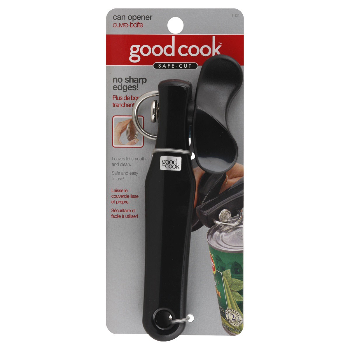 No sharp edges! Leaves lid smooth and clean. Safe and easy to use! Cutting wheel never touches food. Eliminates cross-contamination. 100% satisfaction guarantee. www.goodcook.com. Made in Taiwan.