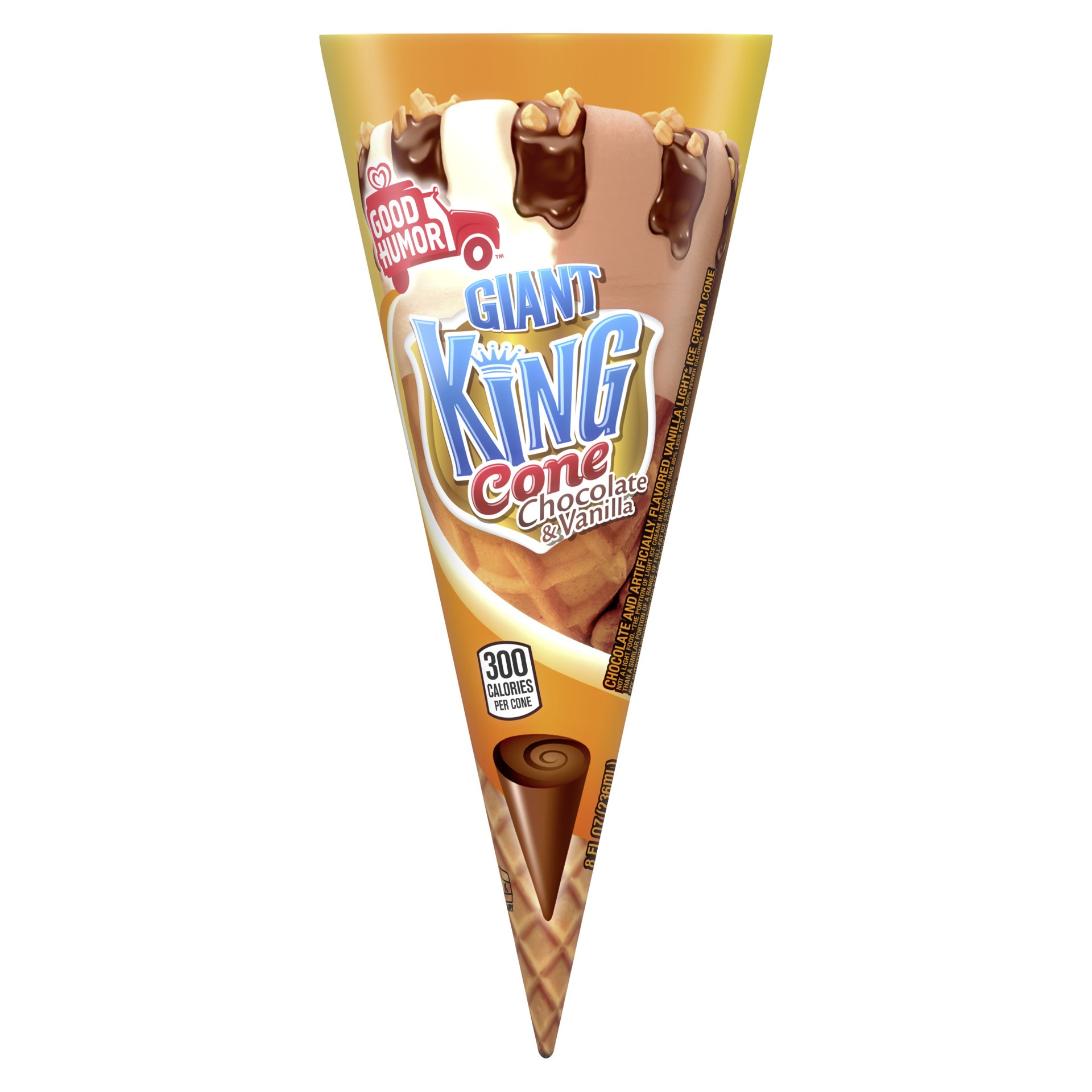 Good Humor Vanilla Chocolate Giant King Cone 8 oz is a giant dessert with a big chocolate tip. One cone to rule them all! Chocolate ice cream and vanilla ice cream in a sugar ice cream cone, crowned c…