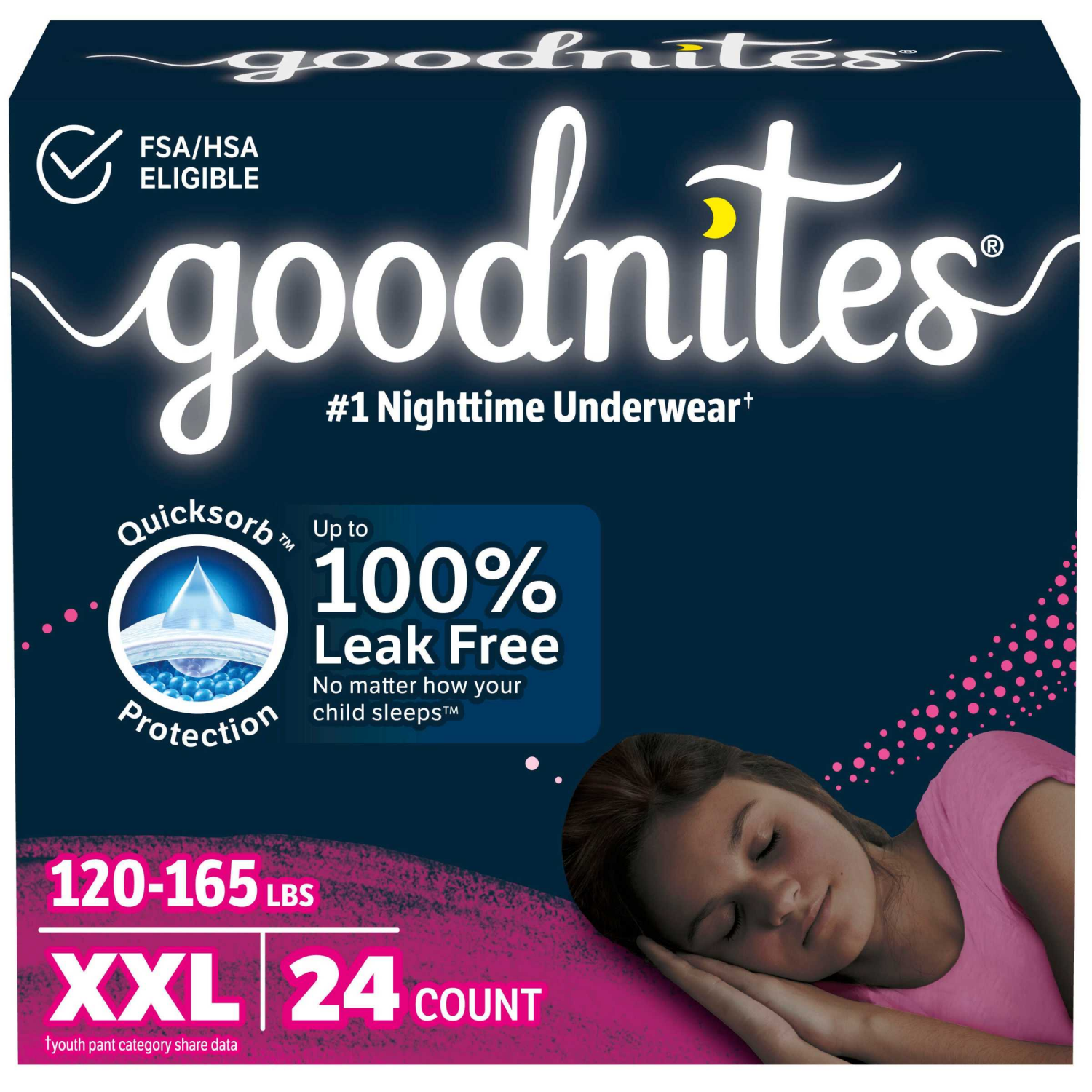 Help your kids wake up dry with Goodnites Nighttime Underwear, the #1 nighttime underwear,* now available in a new XXL size!, These nighttime underwear are made with Quicksorb Protection for up to 100…