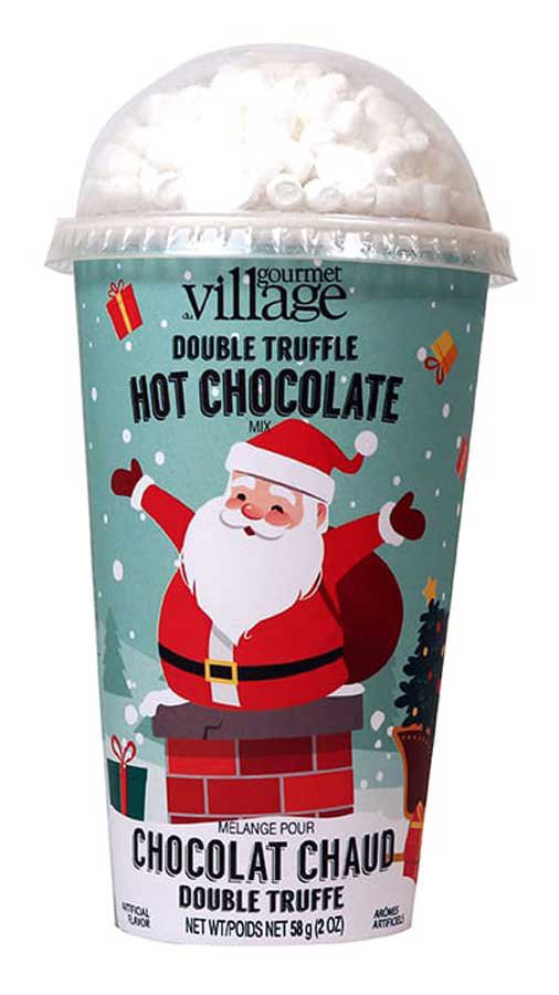 Santa Gift cup filled with Double Truffle Hot Chocolate blend. The packaging has been completely redesigned for this season. More decorative and more environmentally friendly. Recyclable cardboard cup…