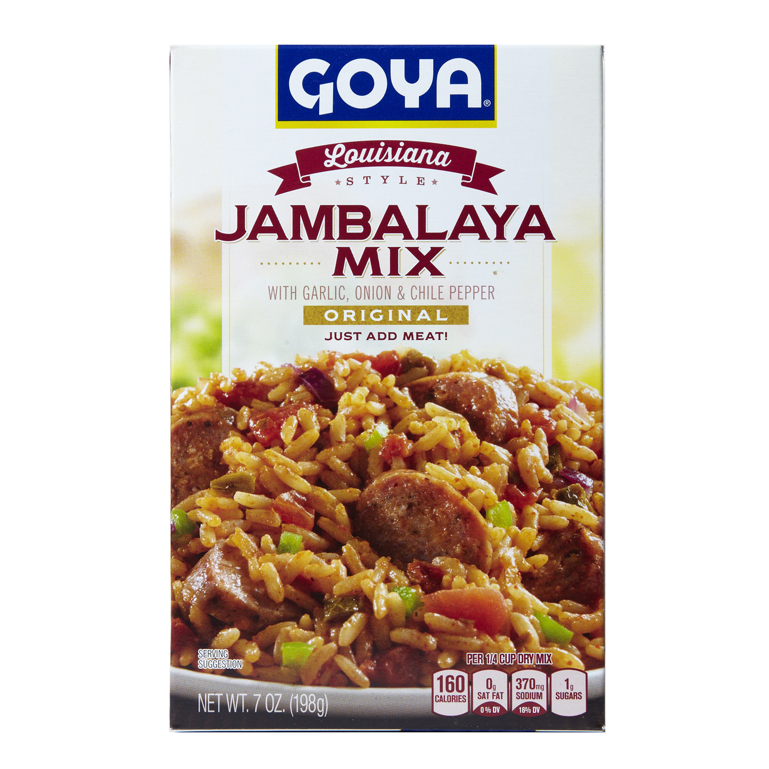 With garlic, onion & chile pepper. Just add meat! Per 1/4 Cup Dry Mix: 160 calories; 0 g sat fat (0% DV); 370 mg sodium (16% DV); 1 g sugars. Bring the flavors and taste of Louisiana home with Goya Ja…