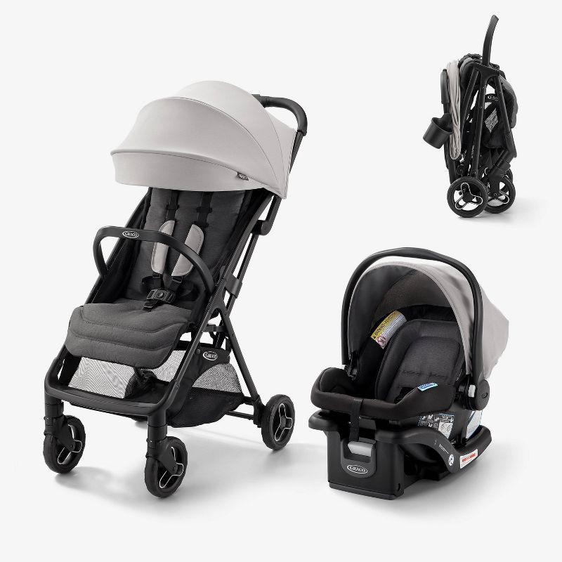 - Includes: Stroller and car seat, infant car seat base, removable belly bar that doubles as a carry handle, leatherette handle, UV 50 canopy, storage basket, parent cup holder