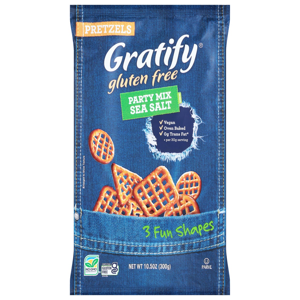 Vegan. 0 g trans fat (per 30 g serving). Certified gluten free. No GMO ingredients. Oven baked. 3 fun shapes. Get gratified. Good to Know: Gratify gluten free Pretzels are baked snacks that contain no…