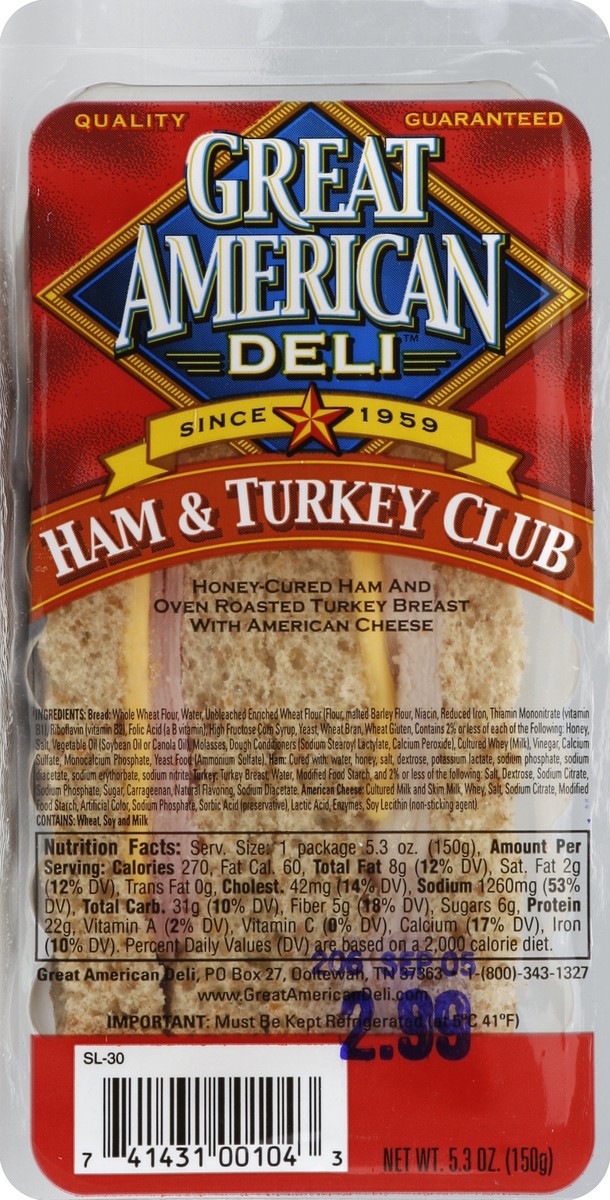 Quality guaranteed. Since 1959. Honey-cured ham and oven roasted turkey breast with American cheese.