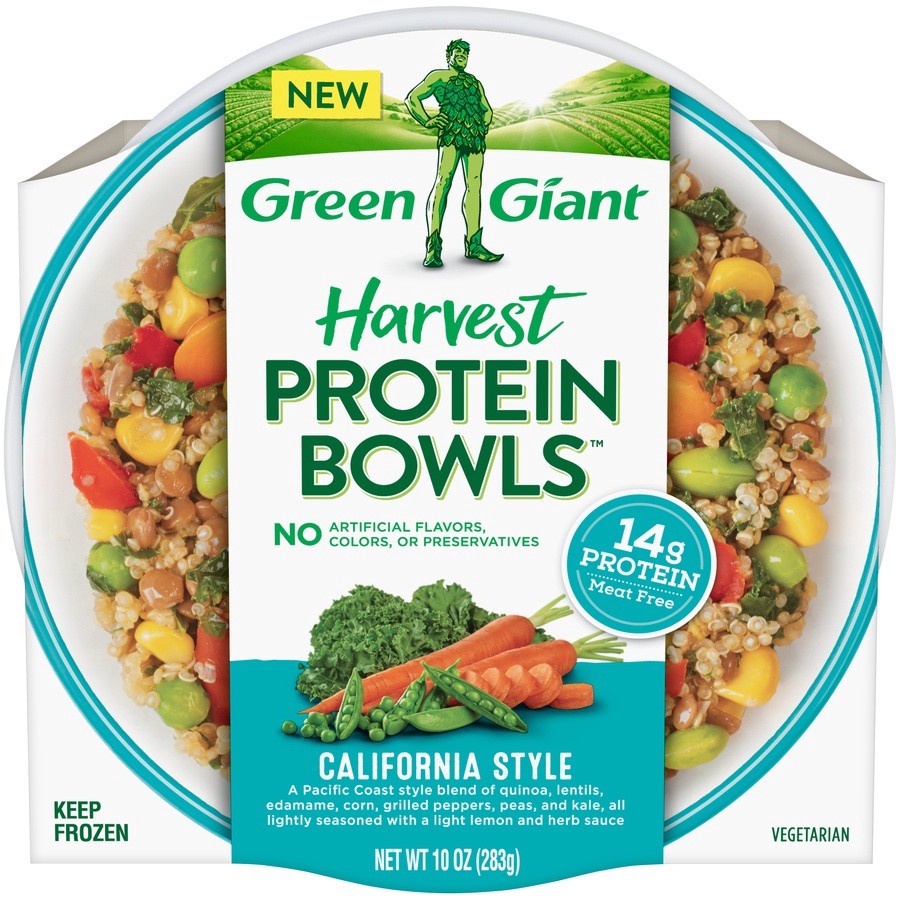 Behold the power of plant protein! Green Giant Harvest Protein Bowls California Style is a Pacific Coast style blend of quinoa, lentils, edamame, corn, grilled peppers, peas, and kale, all lightly sea…