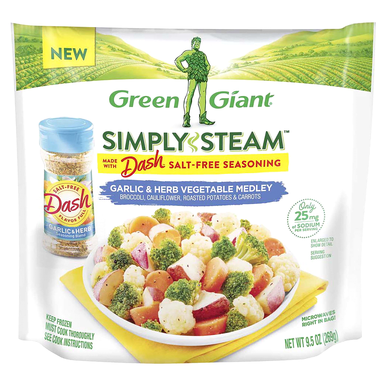 Green Giant and Dash team up to bring you flavorful veggies with no added salt. Green Giant Simply Steam Garlic and Herb Vegetable Medley delivers the great-tasting steamed vegetables you and your fam…