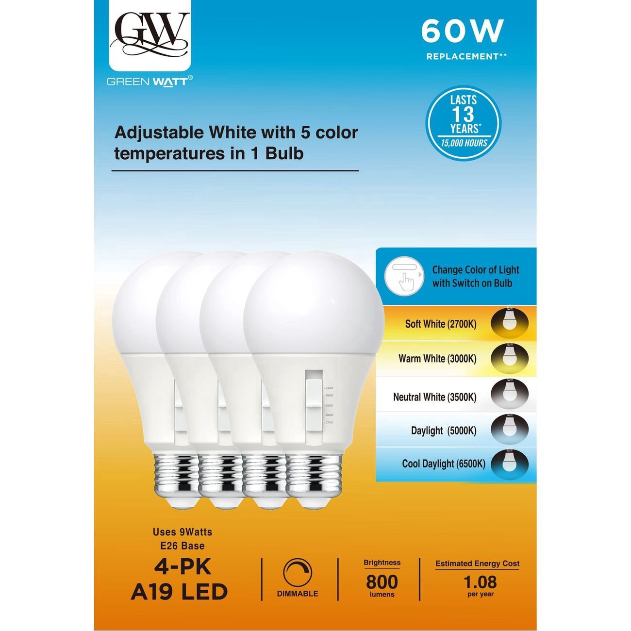 One bulb that allows you to choose any of 5 different light colors. Choose from Soft White (2700k), Warm White (3000k), Neutral White (3500k). Daylight (5000k) or Cool Daylight (6500k).• 9W (60-Watt E…