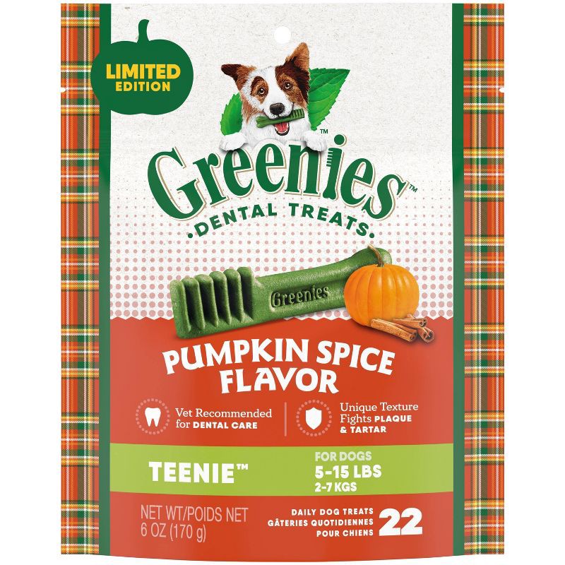 - 22-Count Pack: Contains (1) 6 oz. 22-count pack of Greenies Pumpkin Spice Flavor Teenie Size, Veterinarian-Recommended for Dental Care, Dog Treat Chews, Limited Edition.