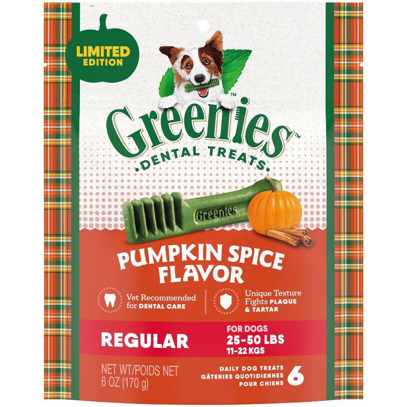 - 6-Count Pack: Contains (1) 6 oz. 6-count pack of Greenies Pumpkin Spice Flavor Regular Size, Veterinarian-Recommended for Dental Care, Dog Treat Chews, Limited Edition.