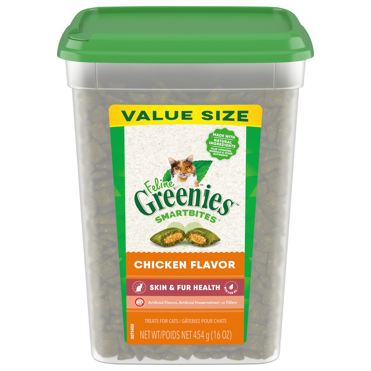 Calorie Content (Calculated): 4066 Kcal ME/kg\, 1.7 Kcal ME/treat. Feline Greenies Smartbites Skin & Fur Health Chicken Flavor cat treats are formulated to meet the nutritional levels established by t…