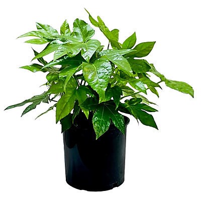 Evergreen reaching 5 to 8 feet tall and 6 to 8 feet wide. Its big, dark green, deeply lobed, and fanlike leaves give it a tropical appearance. Round clusters of small whitish flowers appearing in fall…