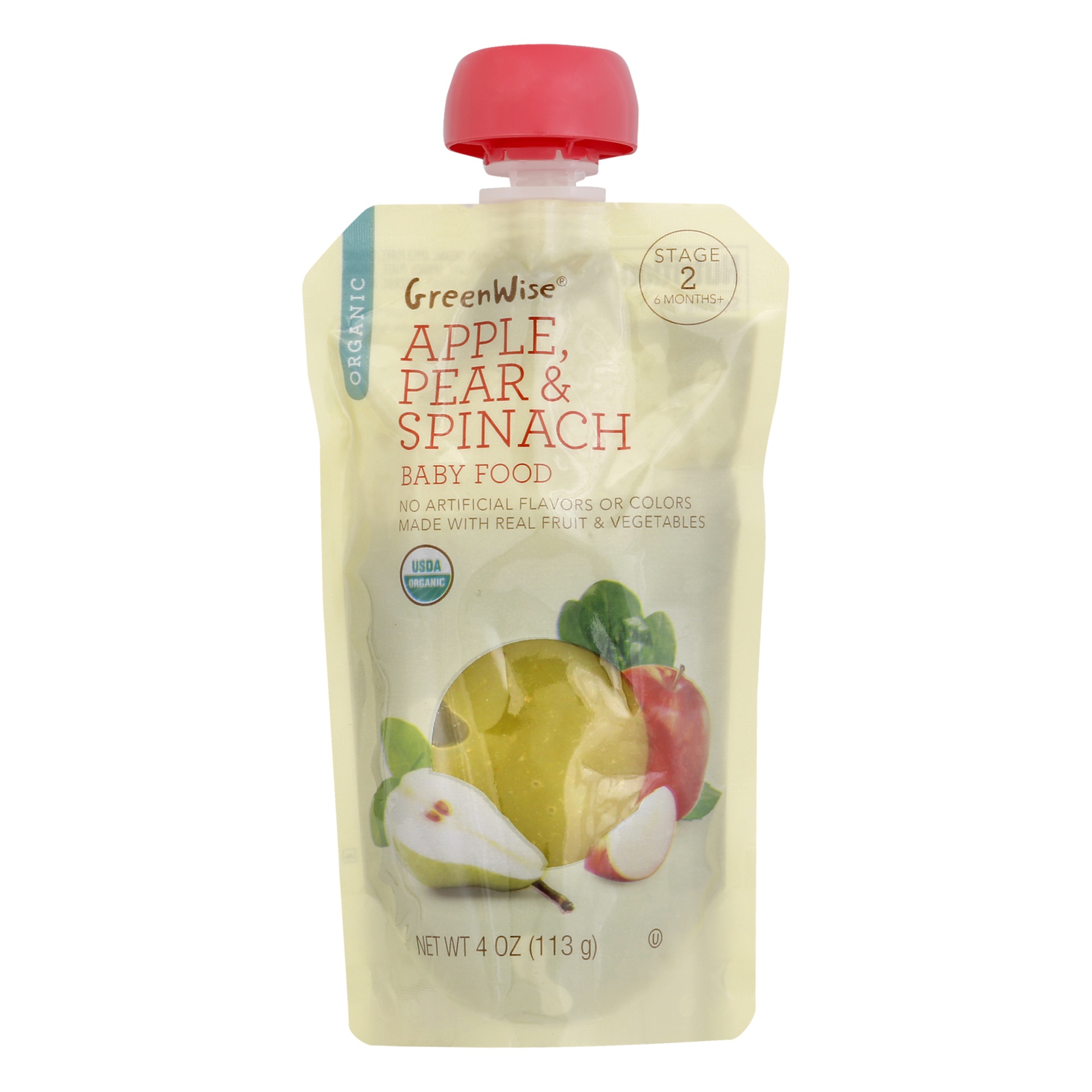 GreenWise Organic Baby Food, Apple, Pear & Spinach, Stage 2, Veggie powered. GreenWise Organic Baby Food blends sweet apples and pears with nutrient-rich spinach. A tasty way to introduce greens to yo…
