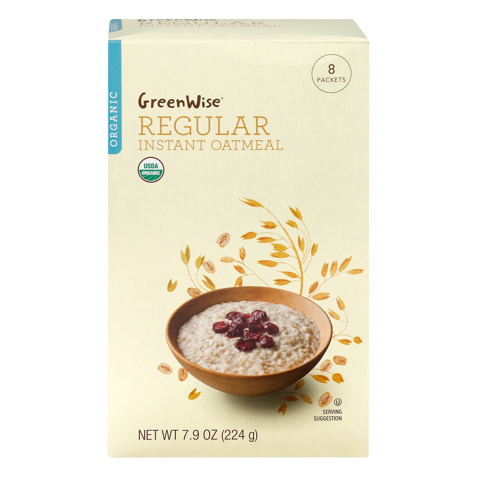 GreenWise Organic Regular Instant Oatmeal, Wholesome morning start. GreenWise Organic Instant Oatmeal is made from 100% whole grain oats. A warm, comforting breakfast that's ready in minutes and perfe…