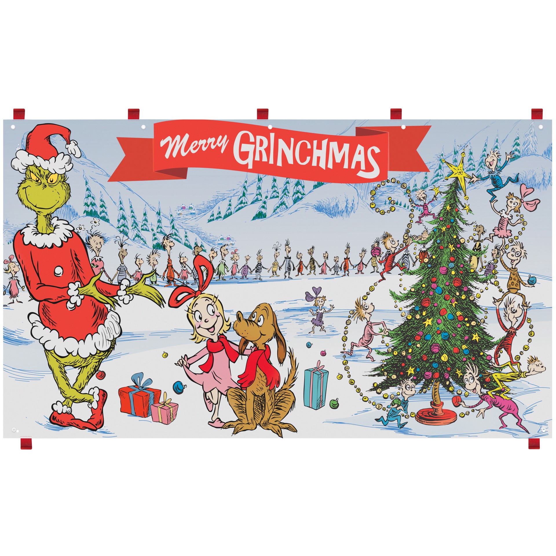 7.8-FT W x 4.5-IN H indoor Grinch seasonal backdrop with Who-ville Christmas scene. Features a Who-ville Christmas scene with the Grinch, Cindy Lou and Max with a "Merry Grinchmas" sentiment. Perfect …