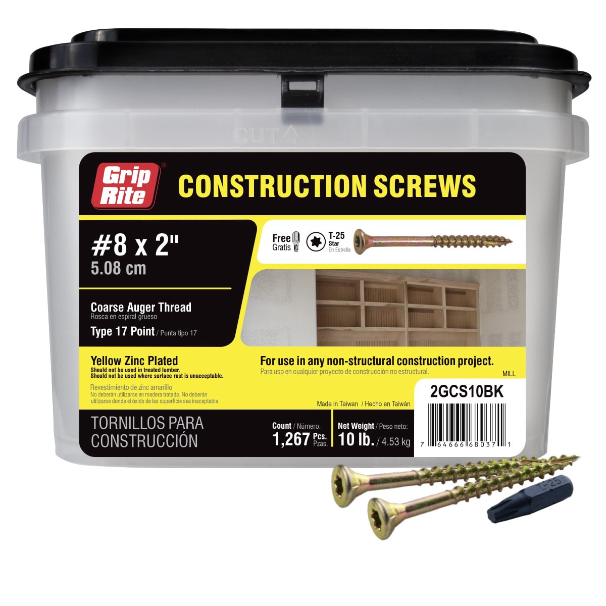 Package quantity approximately 1267 pieces. Designed for general construction projects. Type 17 point reduces need for pre-drilling. Flat head for quick engagement and flush finish. Star drive. Yellow…