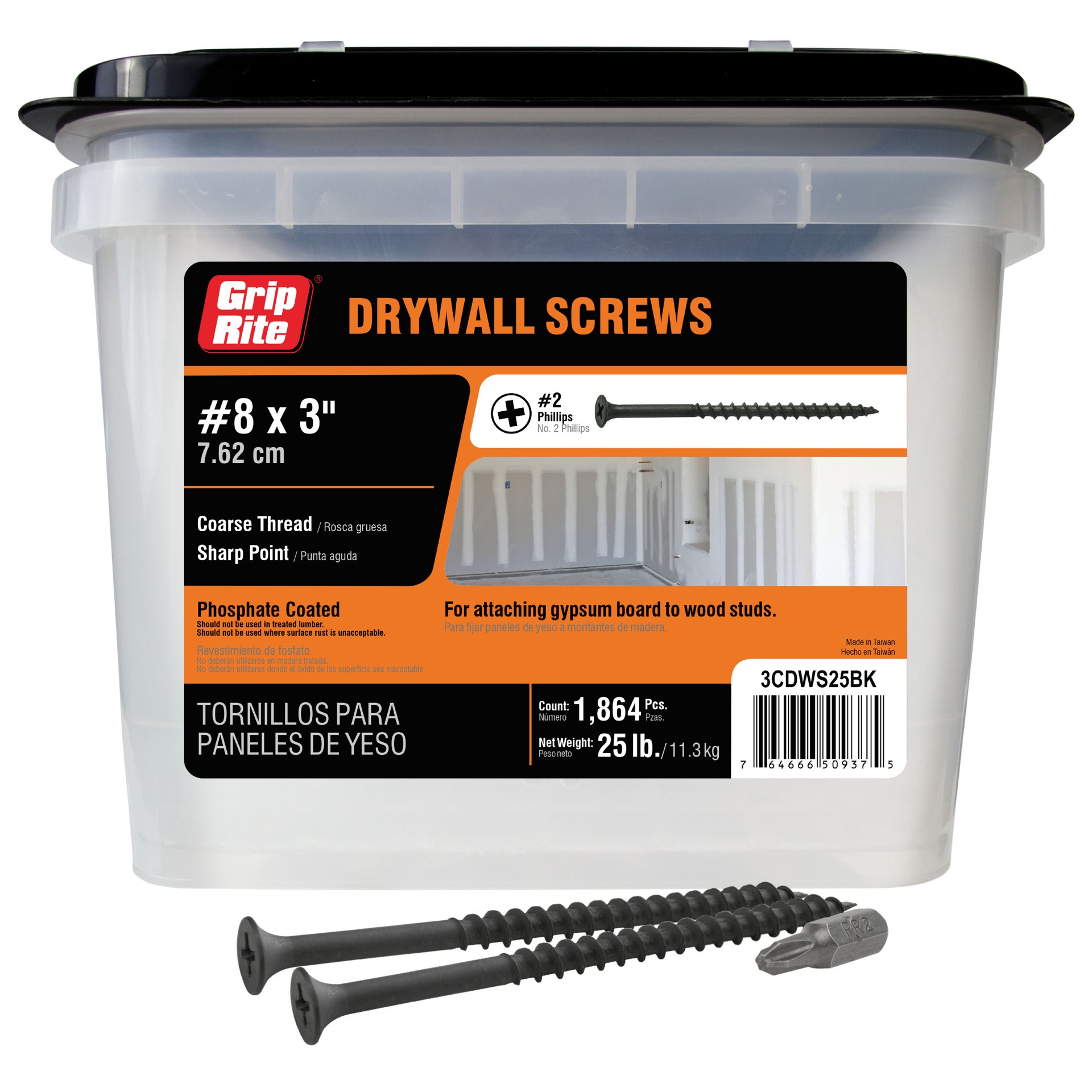 Package quantity approximately 1864 pieces. For attaching drywall to wood studs. Bugle-head countersinks for a clean finish. Black-phosphate coated to make driving easier and improved paint and mud ad…