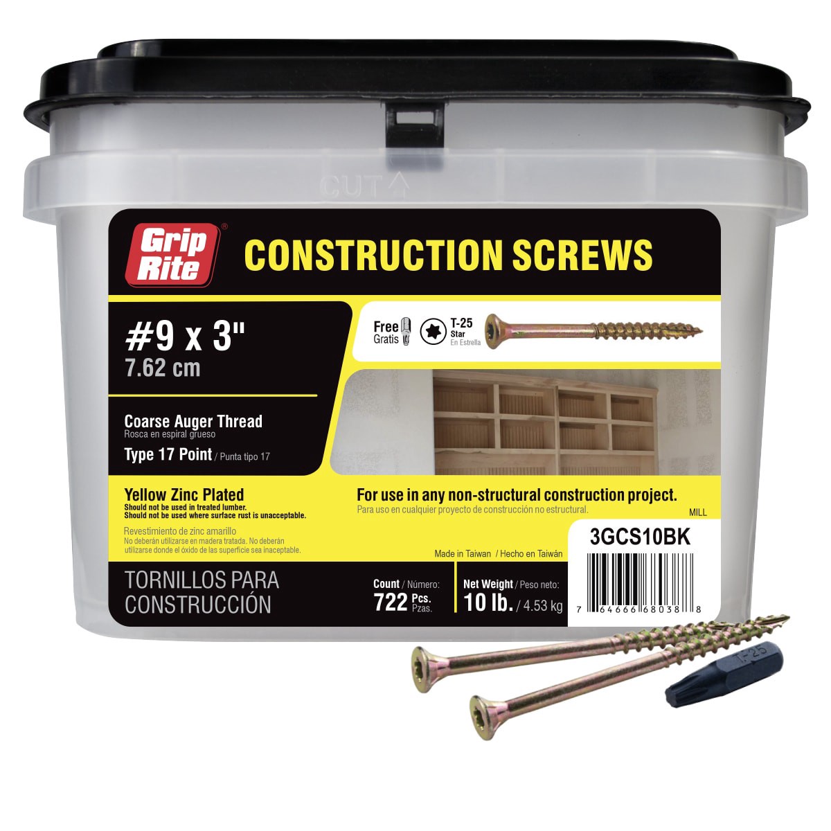 Package quantity approximately 722 pieces. Designed for general construction projects. Type 17 point reduces need for pre-drilling. Flat head for quick engagement and flush finish. Star drive. Yellow …