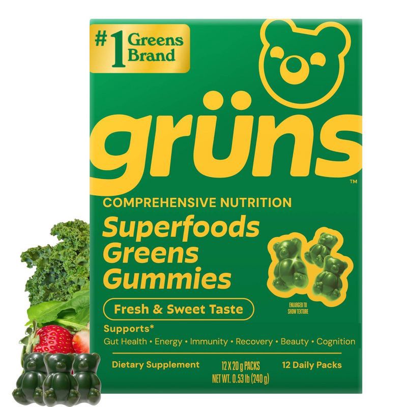 - NO MESS, NO STRESS: Grüns is thoughtfully formulated to be a delicious and seamless addition to your daily routine with our convenient individual snack packs. Each pack contains 8 tasty gummy bears so there's no more cobbling together handfuls of supplements. Enjoy the delightful flavor and benefits of our comprehensive nutrition gummies anytime, anywhere - making it easy to get nutrition on the go!