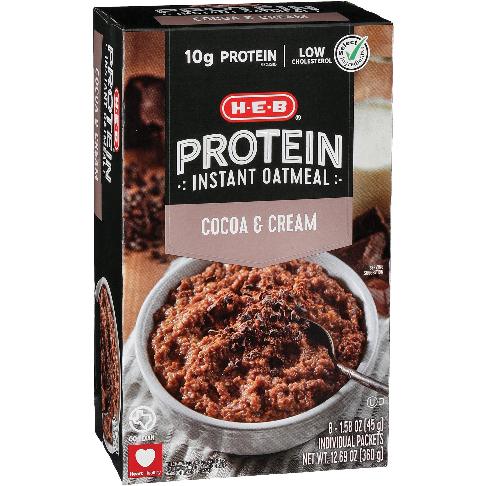 H-E-B Select Ingredients Protein Cocoa & Cream Instant Oatmeal is a delicious way to start your morning with 10g of Protein per Serving! Take a bite into a warm and cozy bowl of oats that is creamy an…