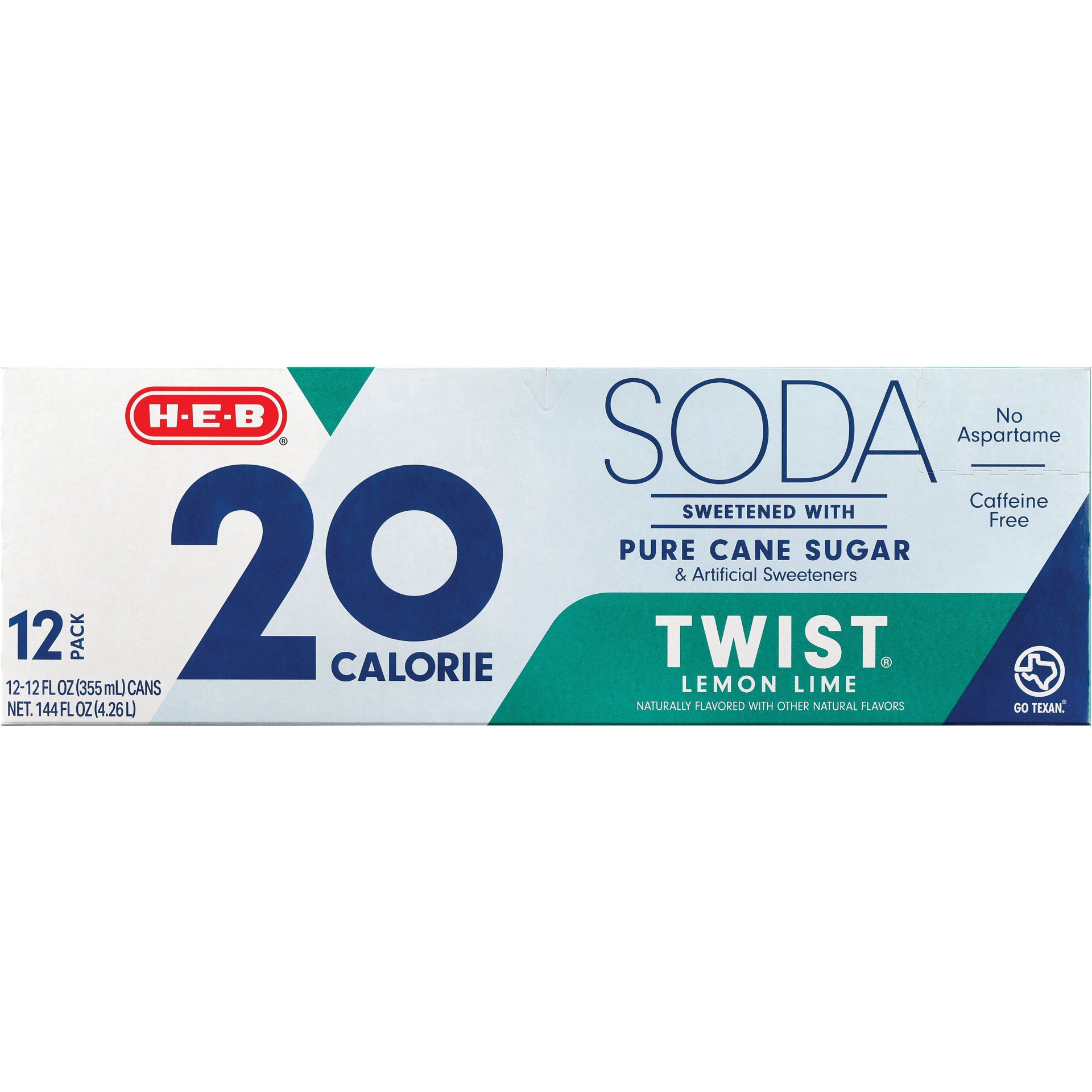 With only 20 calories in every can, H-E-B Twist Low-Calorie Soda is made with pure cane sugar and artificial sweeteners — but no aspartame! It's still caffeine-free and bursting with lemon-lime taste,…