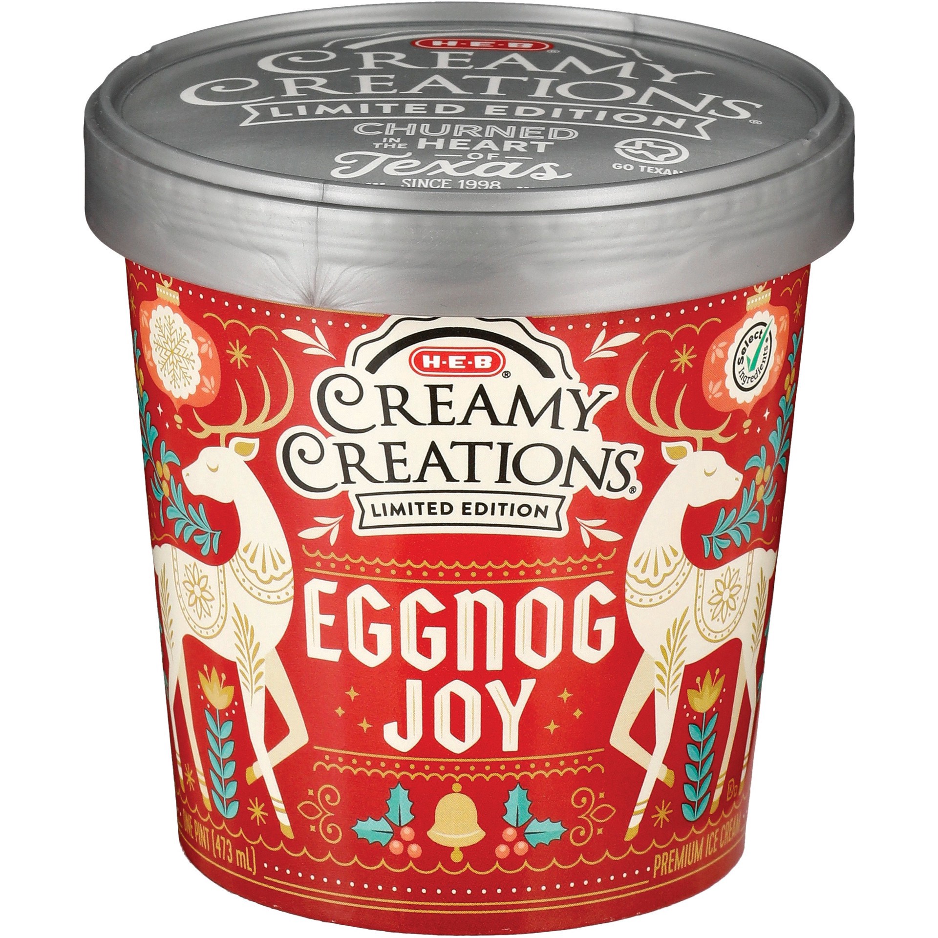 If you're a big fan of eggnog, this pint of H-E-B Creamy Creations ice cream is a happy holiday treat. Named "Eggnog Joy," it's a limited edition that's rich-tasting with just a hint of nutmeg and nat…