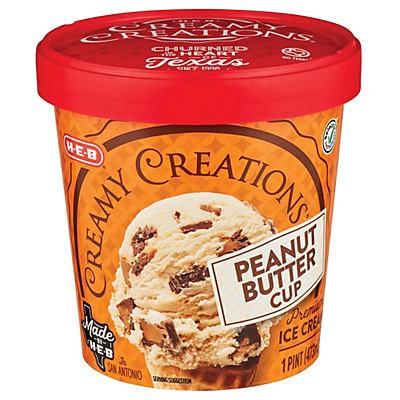 When it's time to chill, grab a frosty pint of H-E-B Creamy Creations Peanut Butter Cup Ice Cream. Made with fresh cream, it's a winning combo of creamy roasted peanut butter and decadent peanut butte…