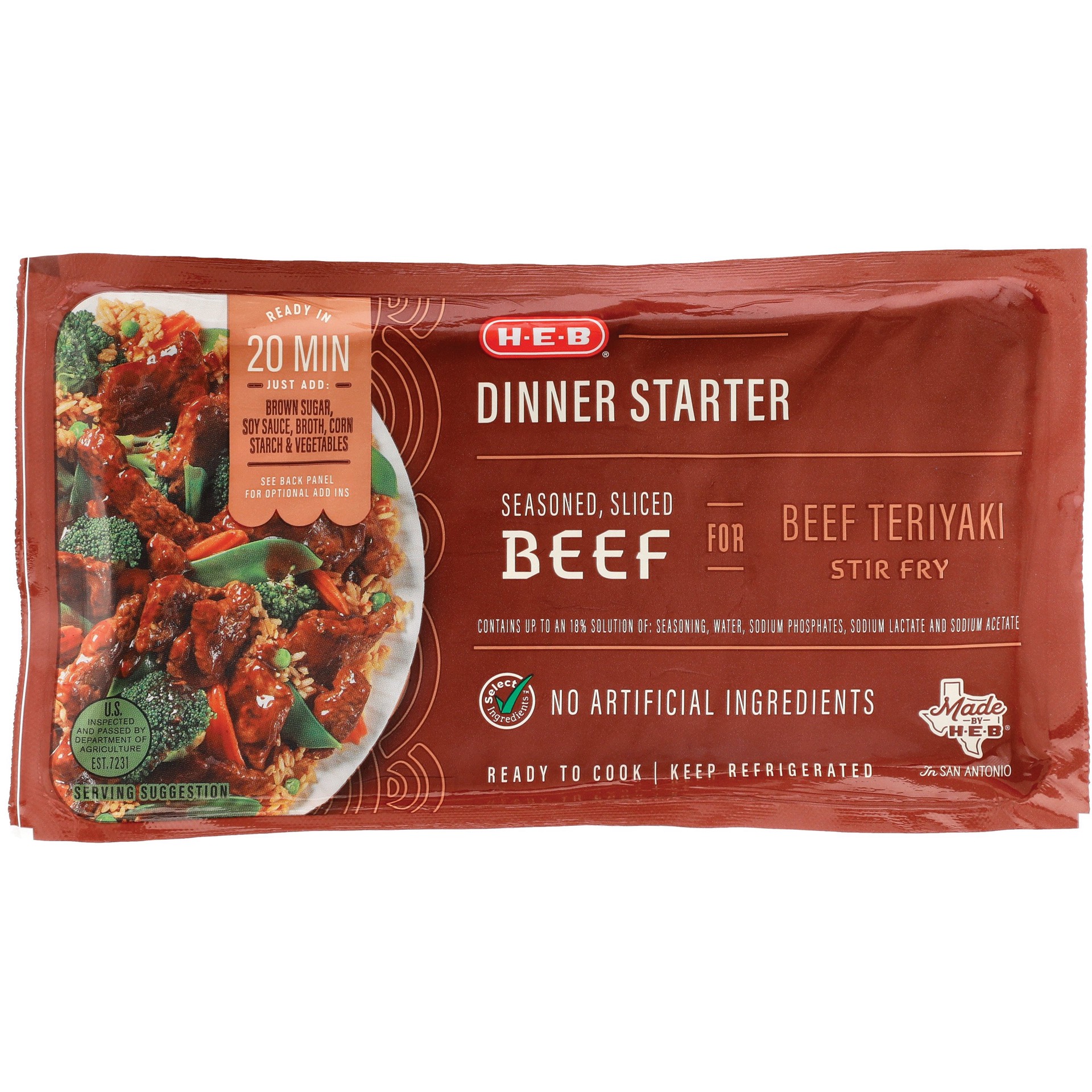 Whip up a beef teriyaki stir fry the easy way with this H-E-B Dinner Starter. Already seasoned, this tender sliced beef has no artificial ingredients. All that's needed is brown sugar, soy sauce, brot…