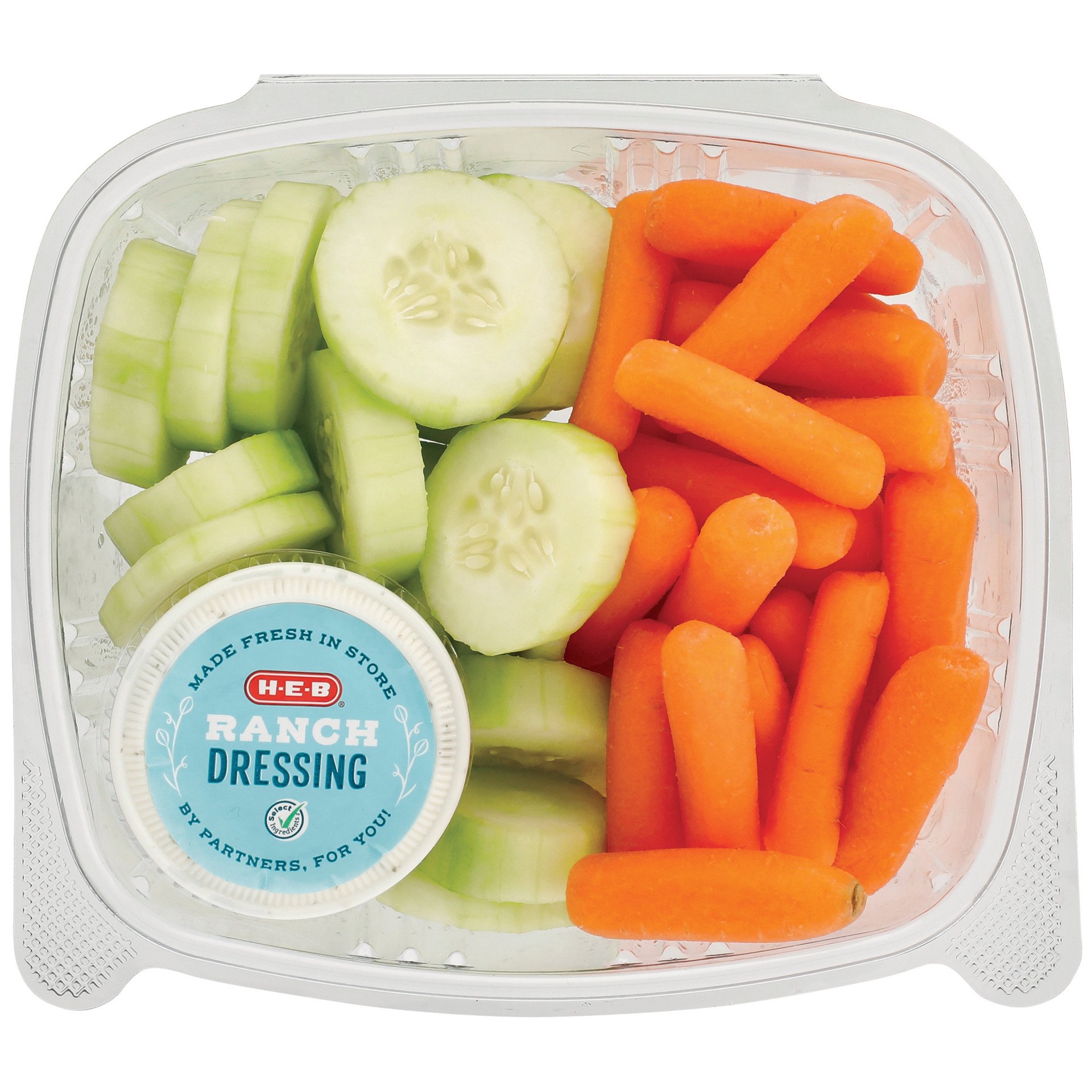 Prepared for your convenience, this large container of sliced cucumbers and baby carrots makes it a little easier to snack smart on the go. Dip the veggies in the included H-E-B Buttermilk Ranch dress…