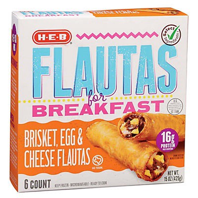 Get your day started by enjoying some H-E-B Breakfast Flautas. Inside each rolled flour tortilla is a delicious filling of brisket, egg and cheese. Easy to heat up from frozen in the oven, they're als…