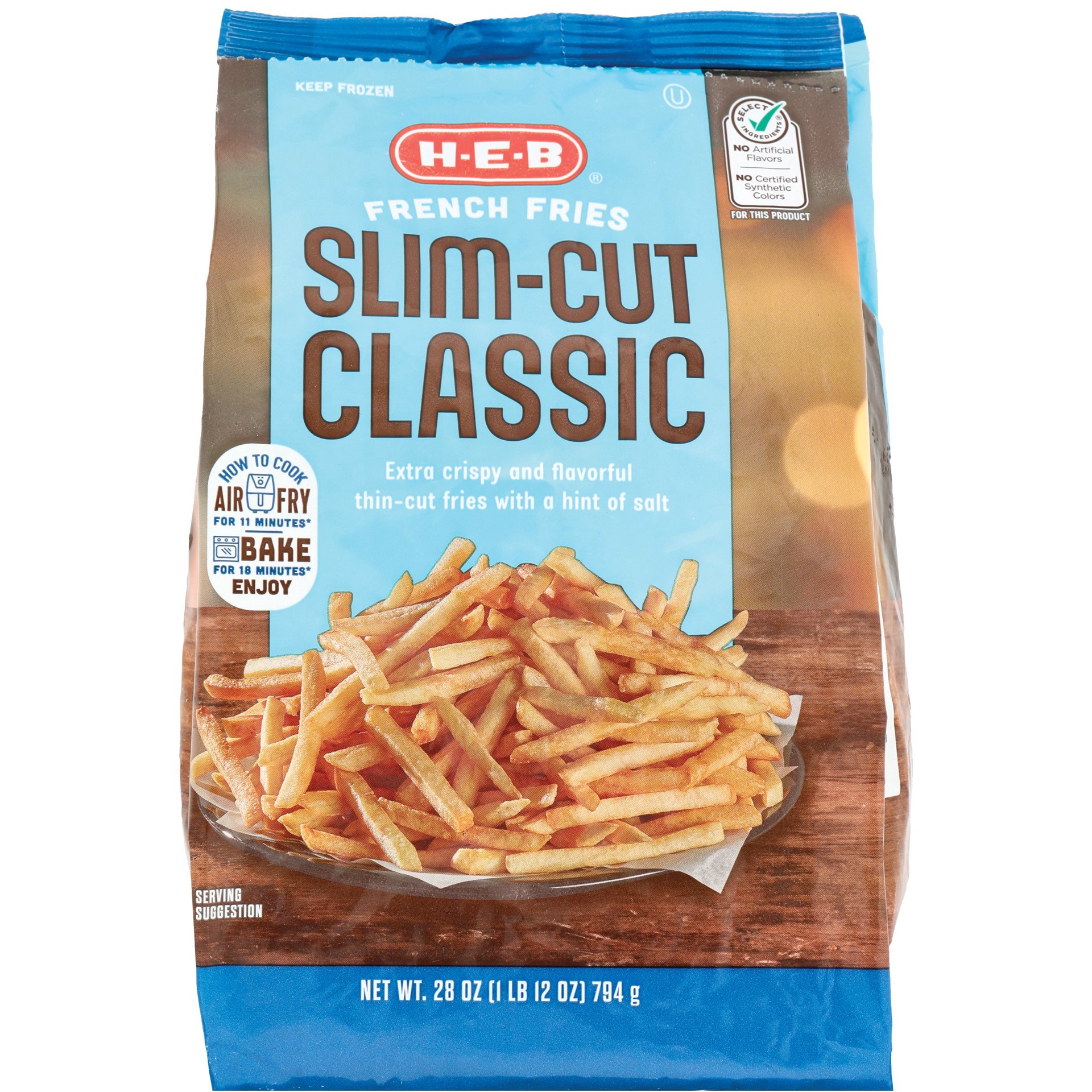 Extra crispy and flavorful with a hint of salt, these H-E-B slim-cut fries are quick and easy to prepare in the air fryer, oven or deep fryer. Crispy and golden-brown, they're ready in less than 20 mi…