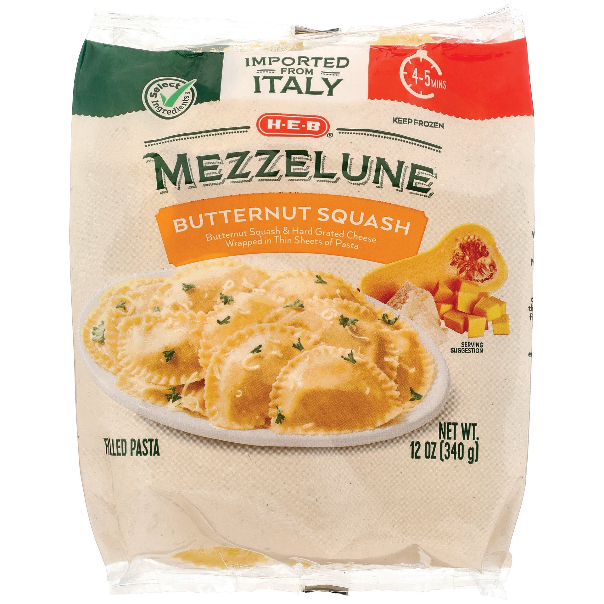 For a quick and easy dinner, try H-E-B frozen mezzelune. Deliciously filled with creamy butternut squash and hard grated cheese, this filled pasta is ready in about 4 - 5 minutes. Imported from Italy.