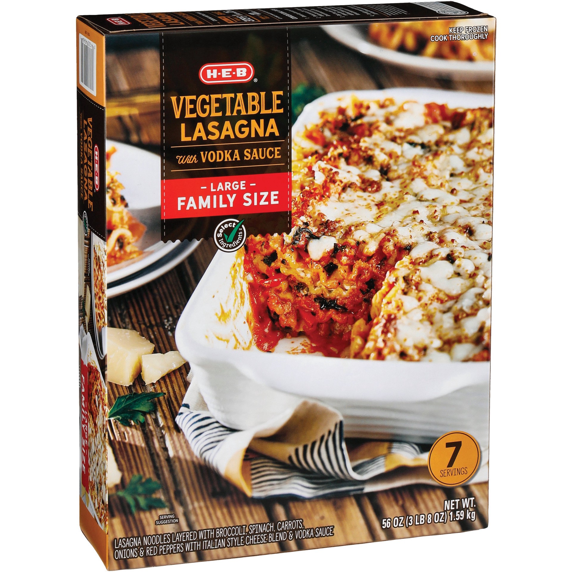 On a busy weeknight, H-E-B Frozen Vegetable Lasagna is an easy answer to what's what dinner. Made with fresh broccoli, spinach, carrots, onions and red peppers, it has layers of lasagna noodles in a r…