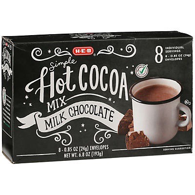 Enjoy a warm and comforting cup of H-E-B hot cocoa. This easy-to-prepare mix is milk chocolate-flavored and only requires hot milk. And since there's no artificial sweeteners, flavors or preservatives…