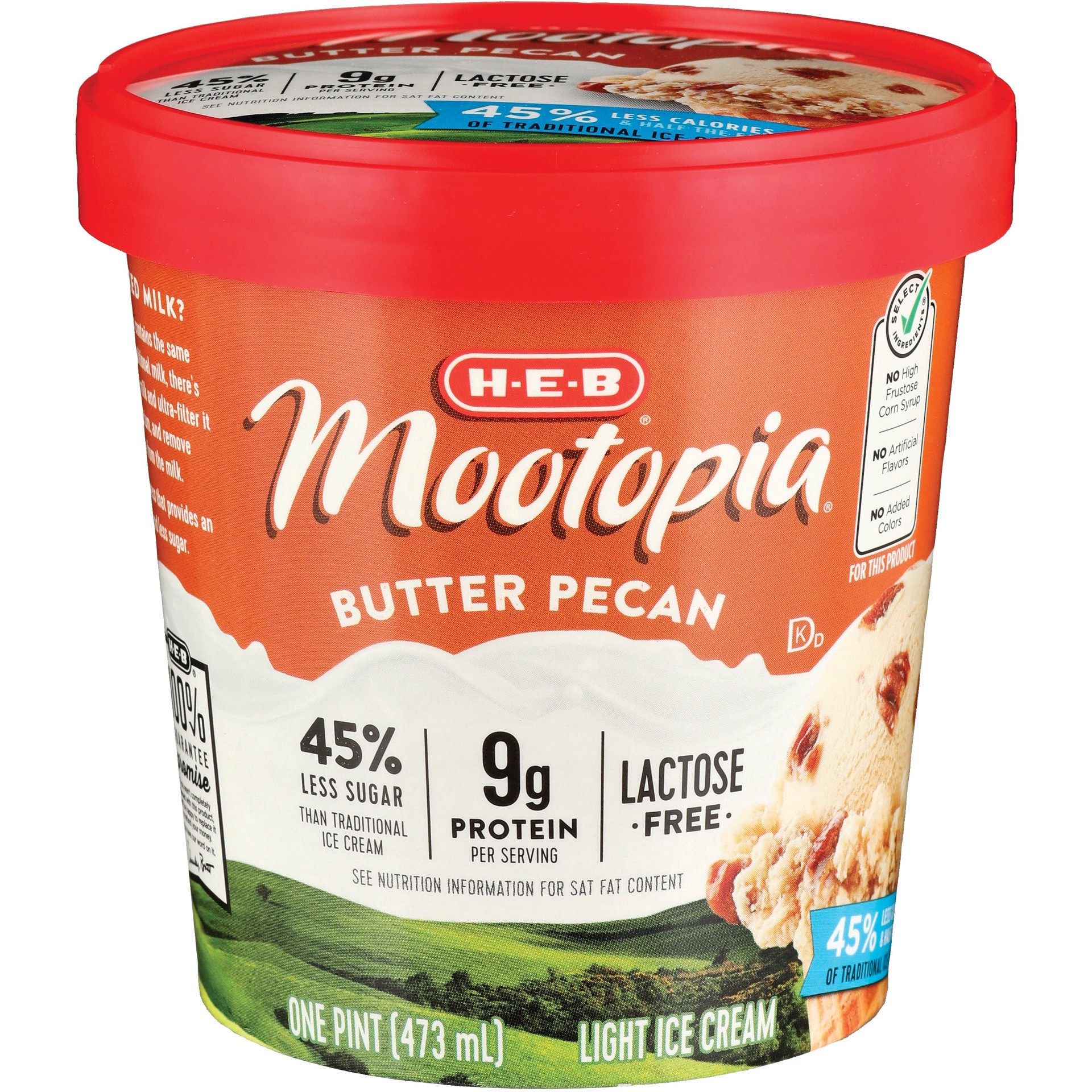 Love ice cream but need a lactose-free option? Scoop up a pint of H-E-B Mootopia butter pecan. This light ice cream has 45% less sugar and calories compared to traditional ice cream, as well as half t…