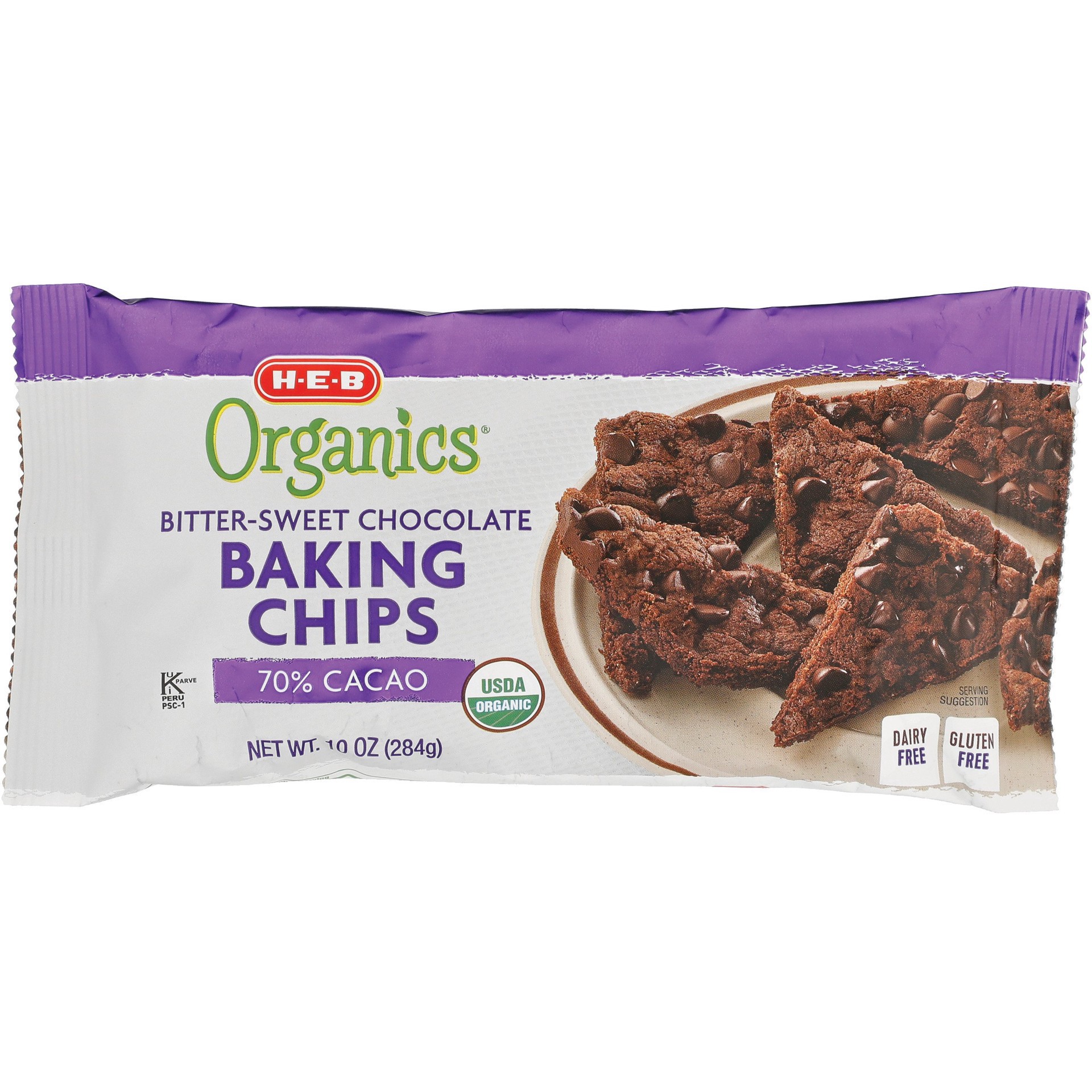 H-E-B Organics Bitter-Sweet Chocolate Baking Chips are made with 70% cacao and are gluten and dairy free. Try the recipe on the package or add to your favorite chocolate chip cookie recipe for the dar…