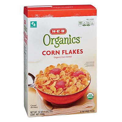 H-E-B Organics Corn Flakes Cereal. Genetic engineering (GMOs) prohibited, sustainable soil management methods used, and grown using only organic compliant materials.