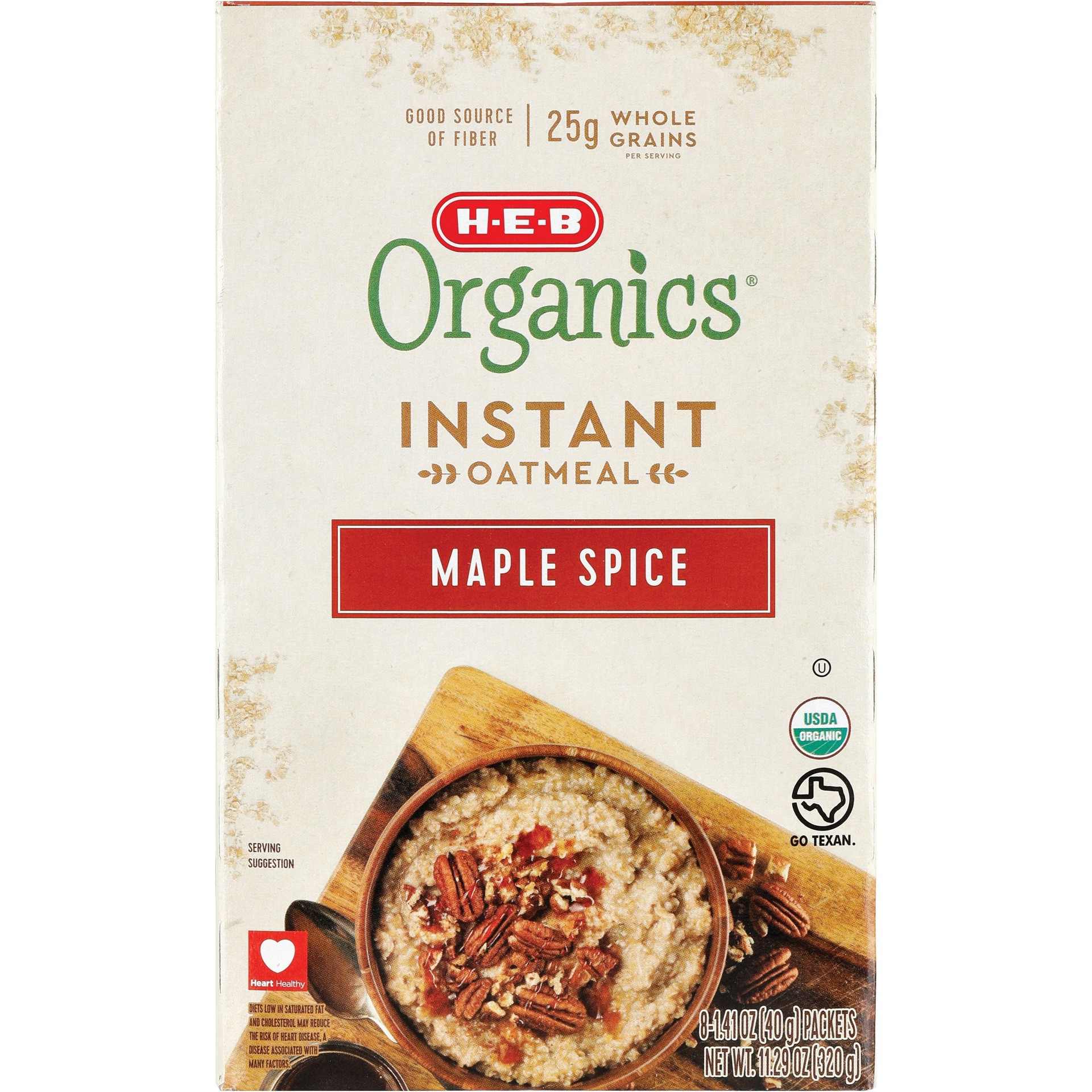 Maple spice and everything nice! H-E-B Organics instant oatmeal is quick and easy to prepare, either with hot water or in the microwave with milk (or water). Sweet with a cinnamon kick, these organic …