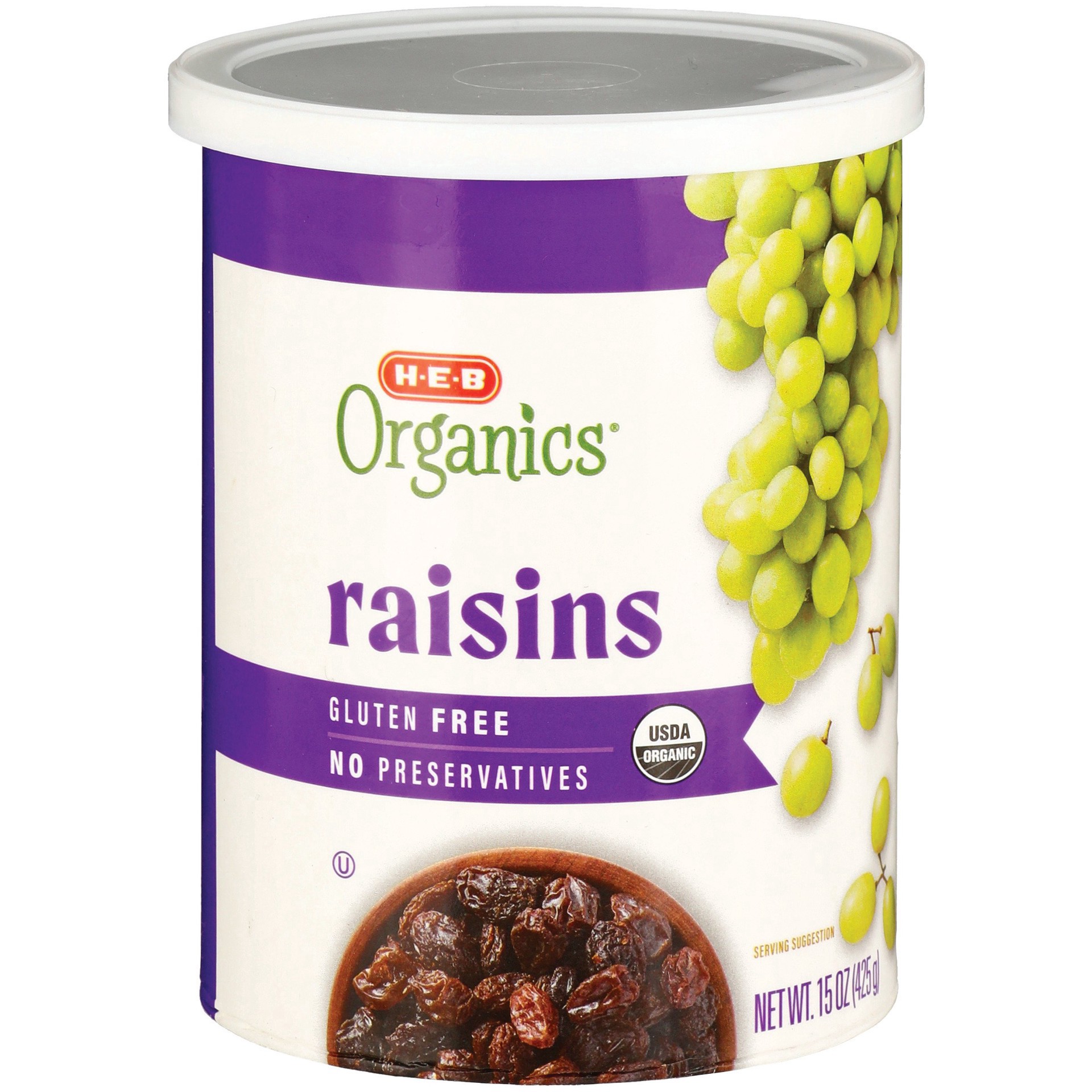 Get your snack-on with our H-E-B Organics Raisins. These tasty, very low sodium and fat free raisins contain no added colors, preservatives or artificial flavors and are delicious in recipes including…