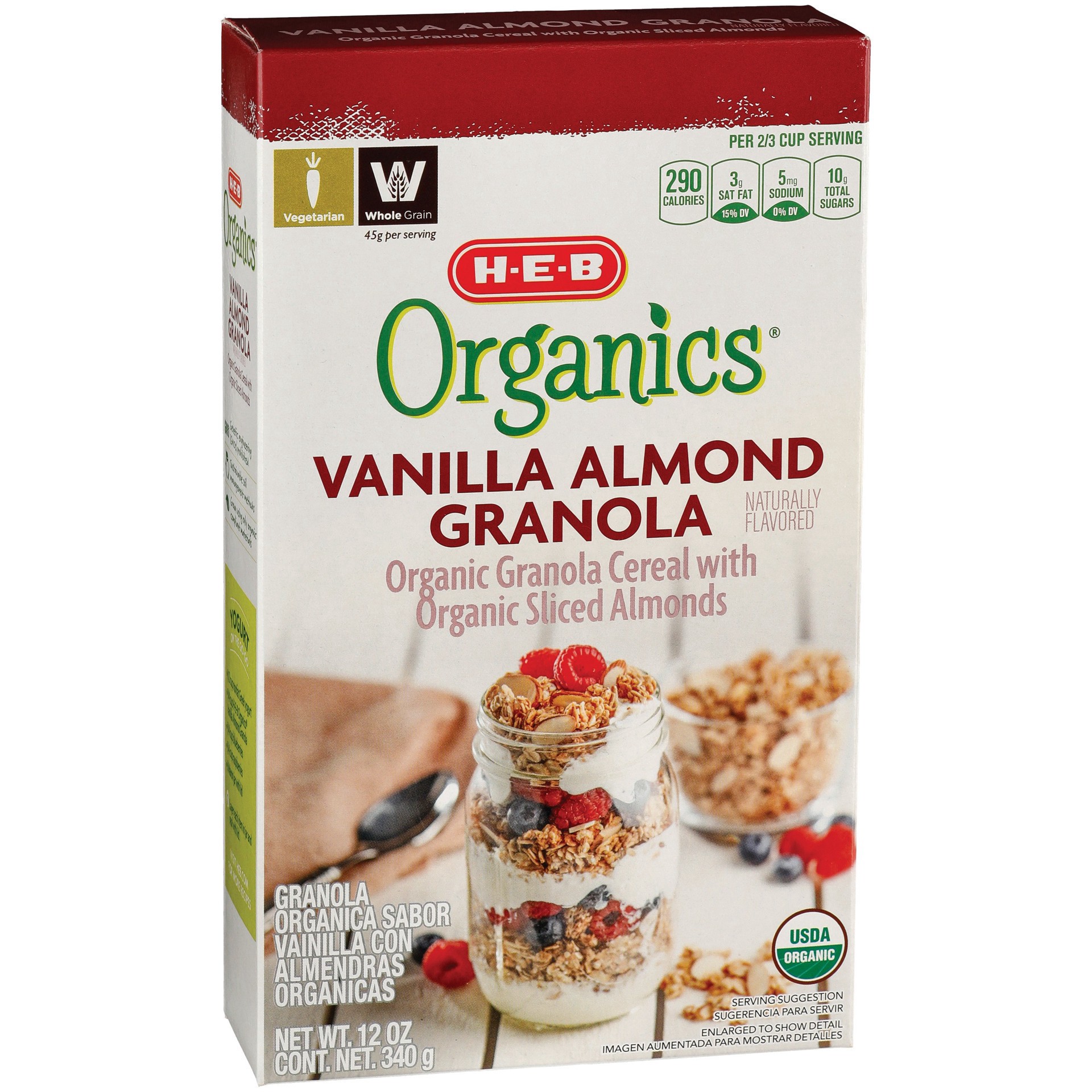 From H‑E‑B Organics, this Vanilla Almond Granola is made with organic whole grain rolled oat flakes, sliced almonds, honey and natural vanilla flavor. And with 45 grams of whole grain per serving, it'…