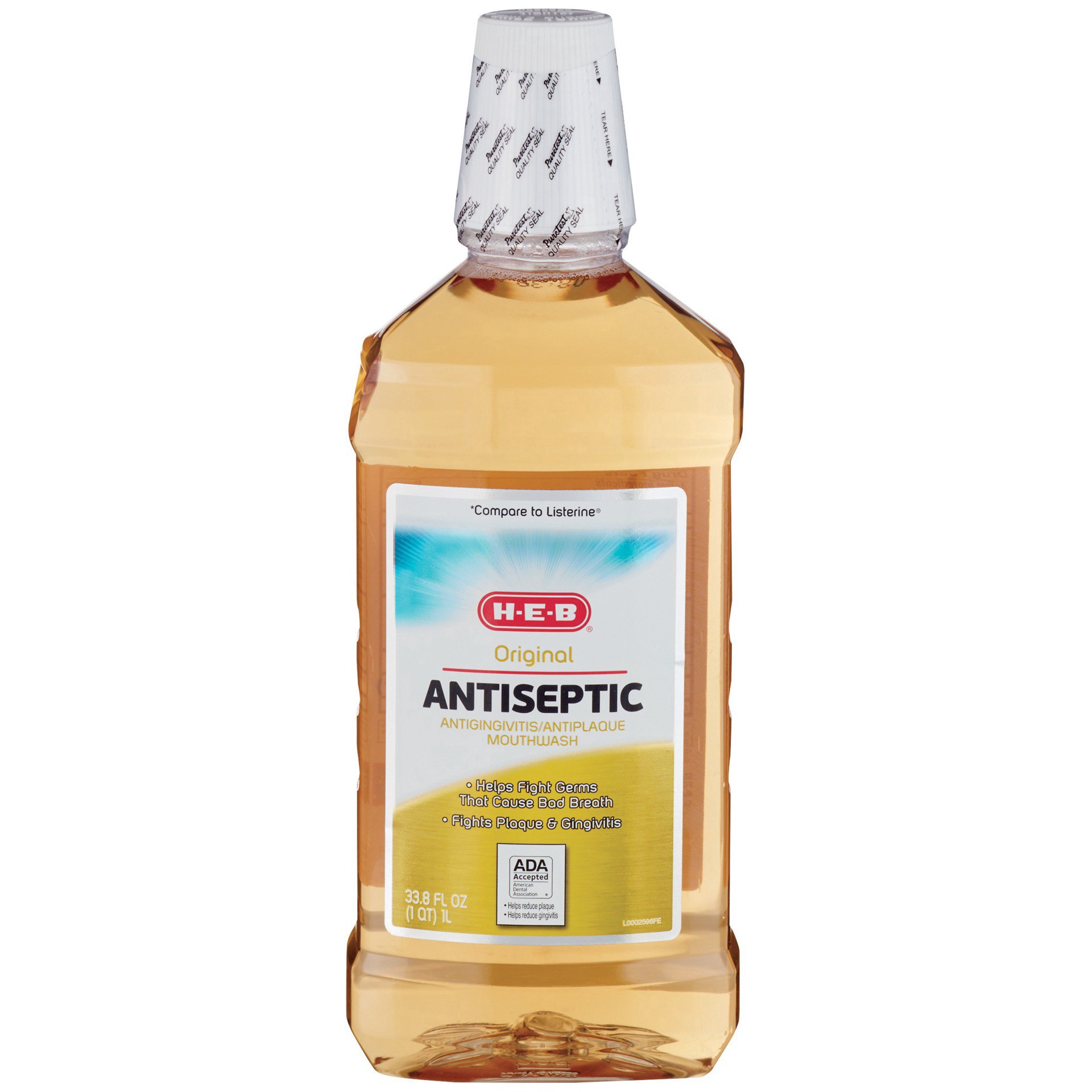 Reveal a cleaner smile with H-E-B Original Antiseptic Mouthwash. This mouthwash helps fight bad breath, kill germs and control plaque that leads to gingivitis.- ADA accepted- Kills germs- Fights bad b…