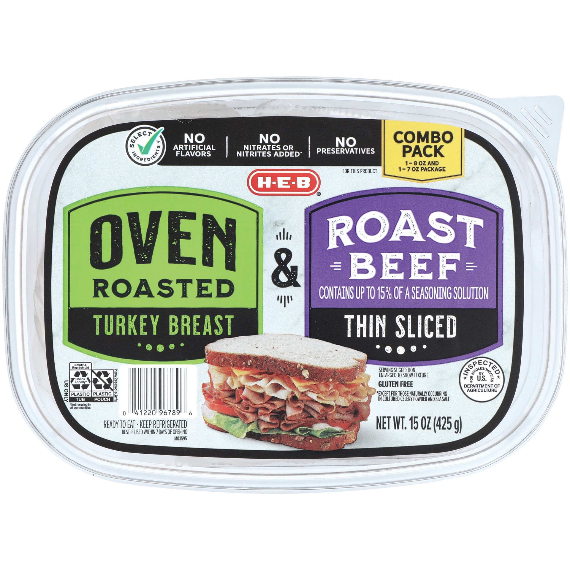 Get double the delicious deli meats with this H-E-B Combo Pack. It features oven-roasted turkey breast and thin-sliced roast beef, both with no artificial flavors or preservatives. Stack some for sand…