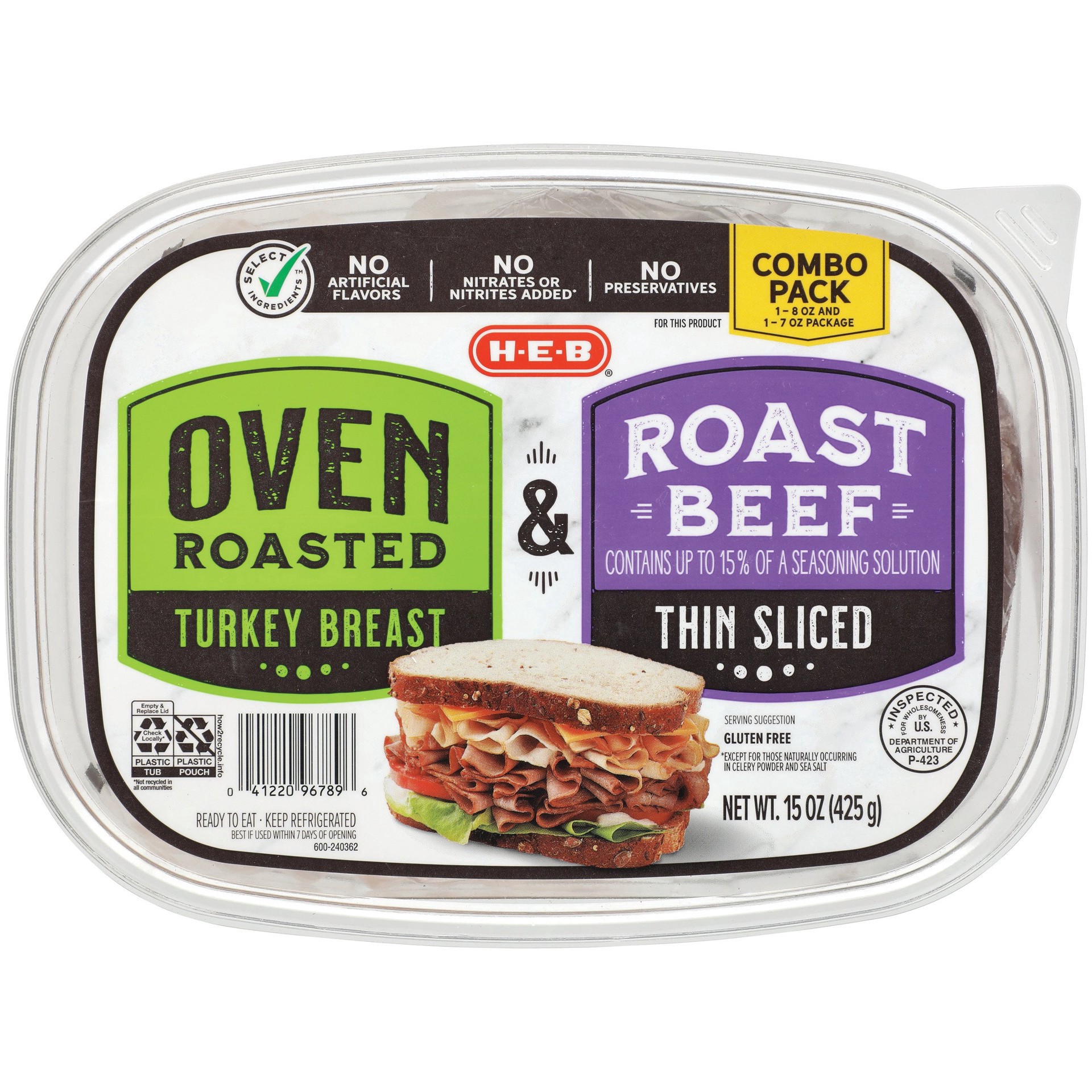 Get double the delicious deli meats with this H-E-B Combo Pack. It features oven-roasted turkey breast and thin-sliced roast beef, both with no artificial flavors or preservatives. Stack some for sand…