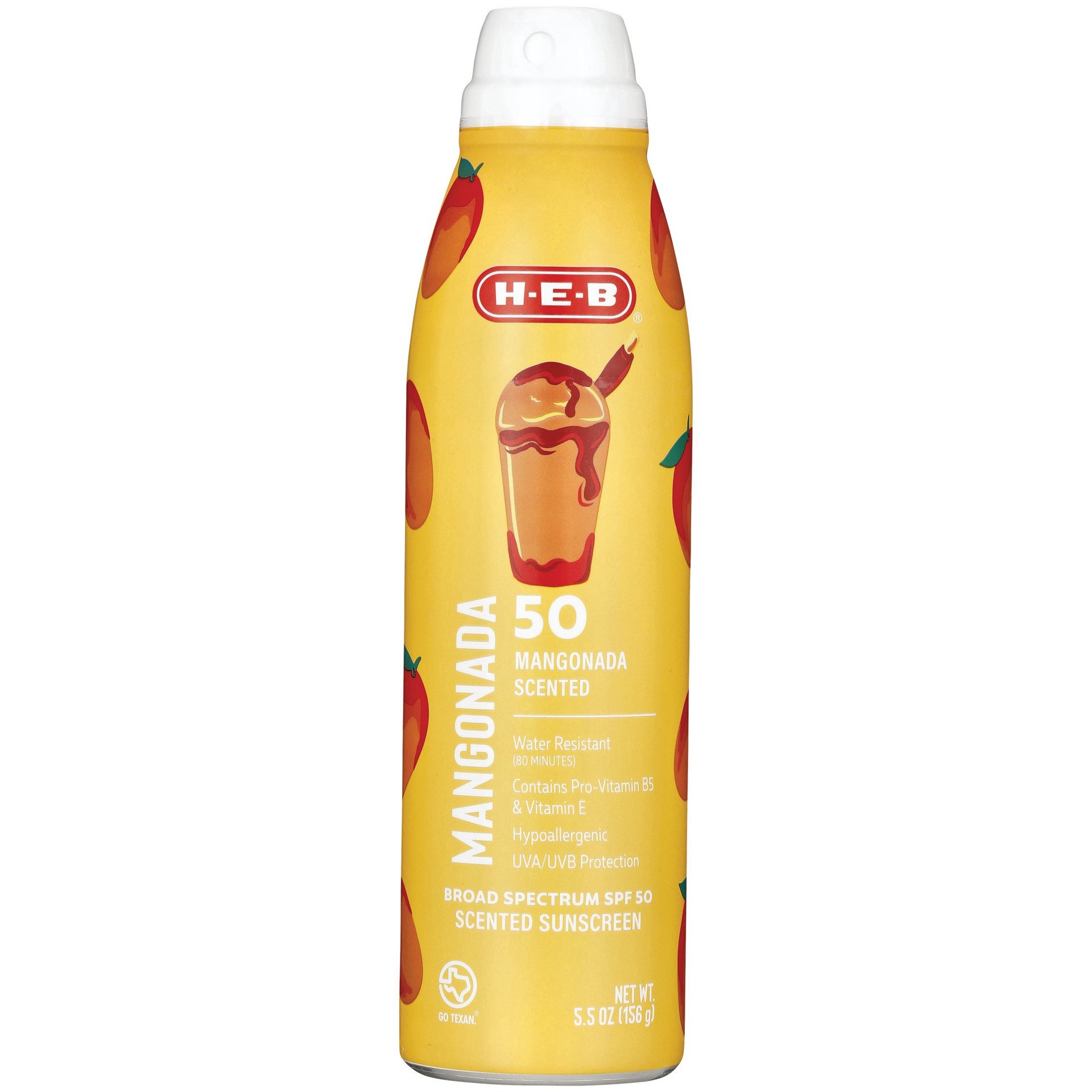Use this H-E-B oxybenzone free mangonada scented sunscreen spray next time you hit the pool, beach or river. This SPF 50 sunscreen blocks premature aging UVA rays and sunburn causing UVB rays for days…