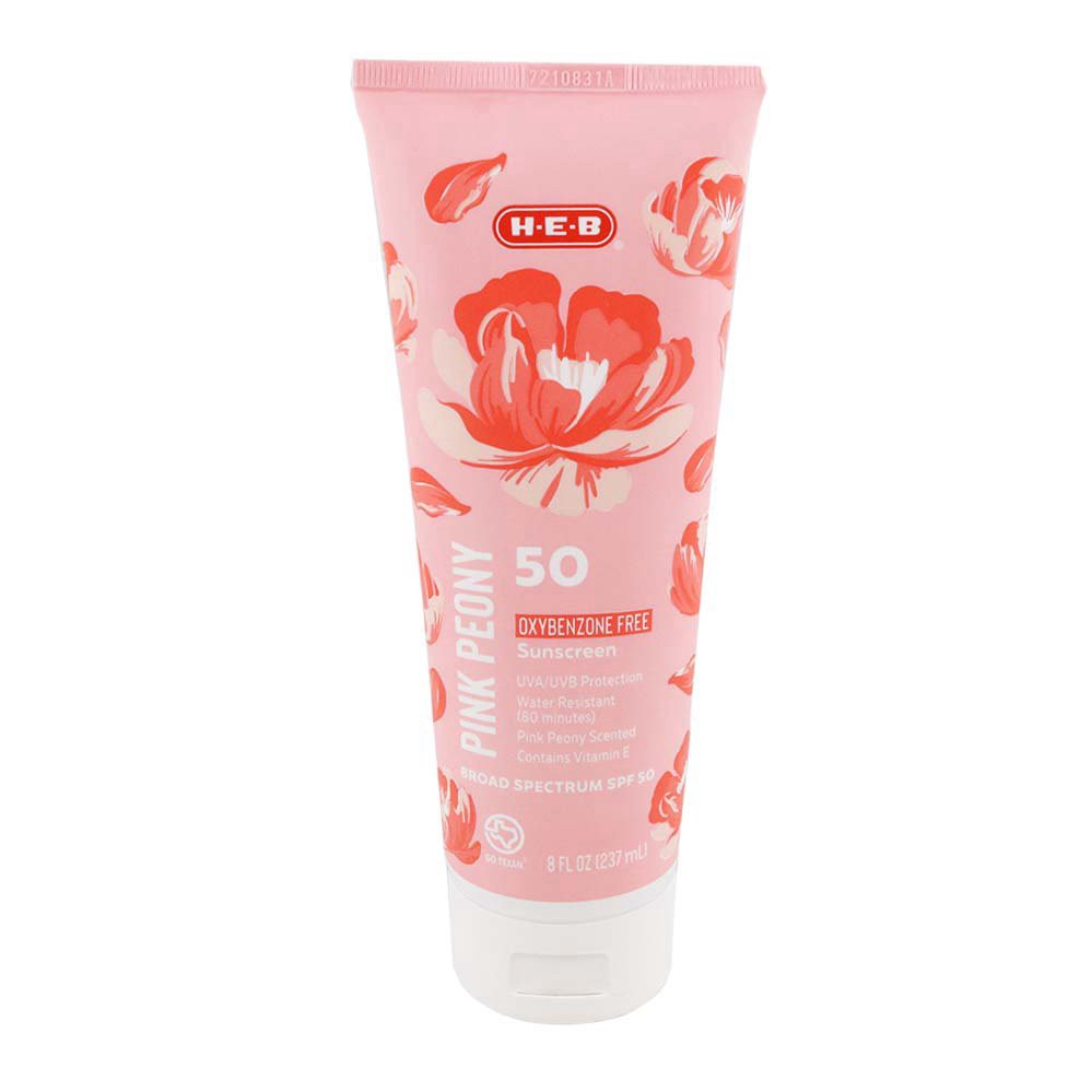 Use this H-E-B oxybenzone free pink peony scented sunscreen lotion next time you hit the pool, beach or river. Blocking premature aging UVA rays along with sunburn causing UVB rays, this SPF 50 sunscr…
