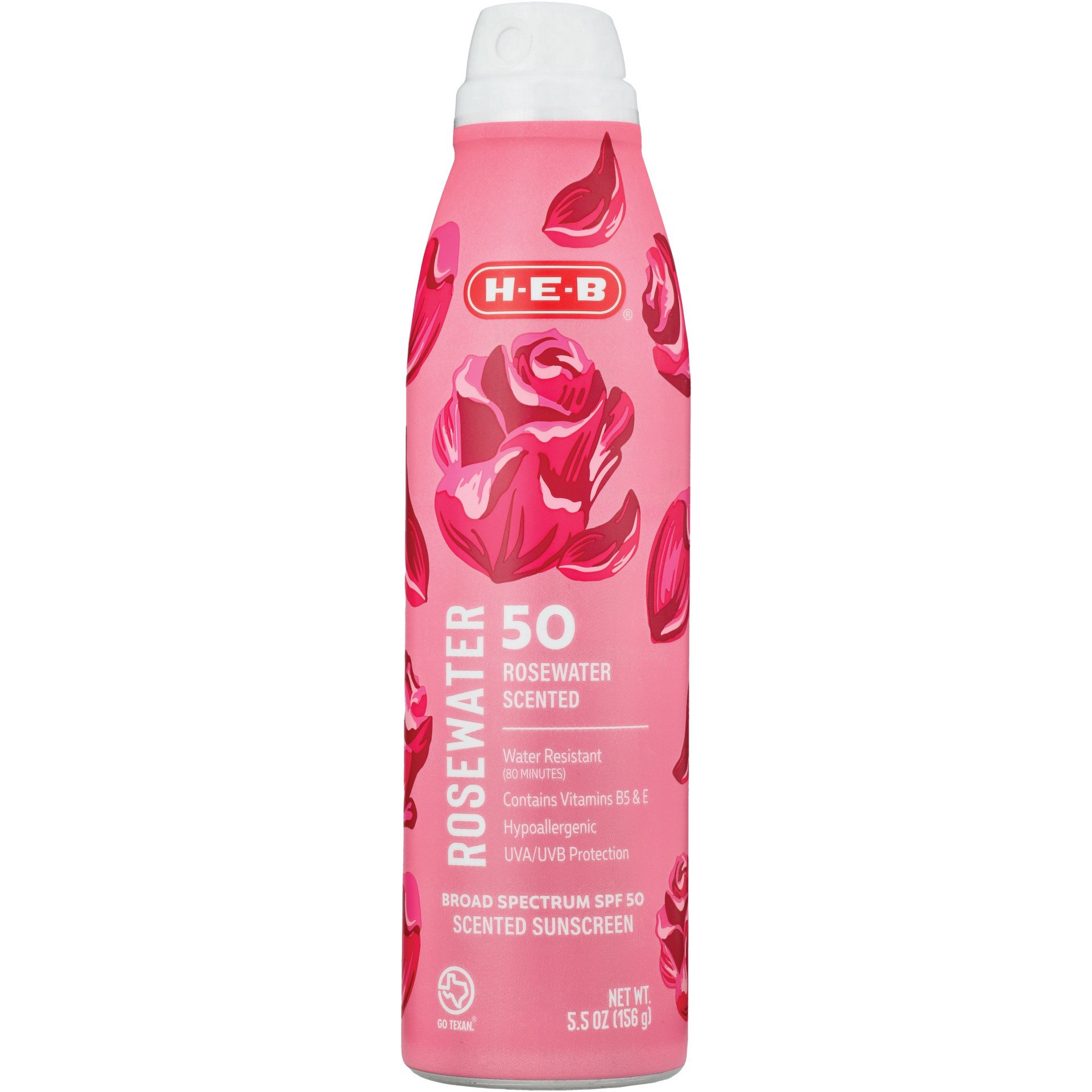 Use this H-E-B oxybenzone free rosewater scented sunscreen spray next time you hit the pool, beach or river. Blocking premature aging UVA rays along with sunburn causing UVB rays, this SPF 50 sunscree…