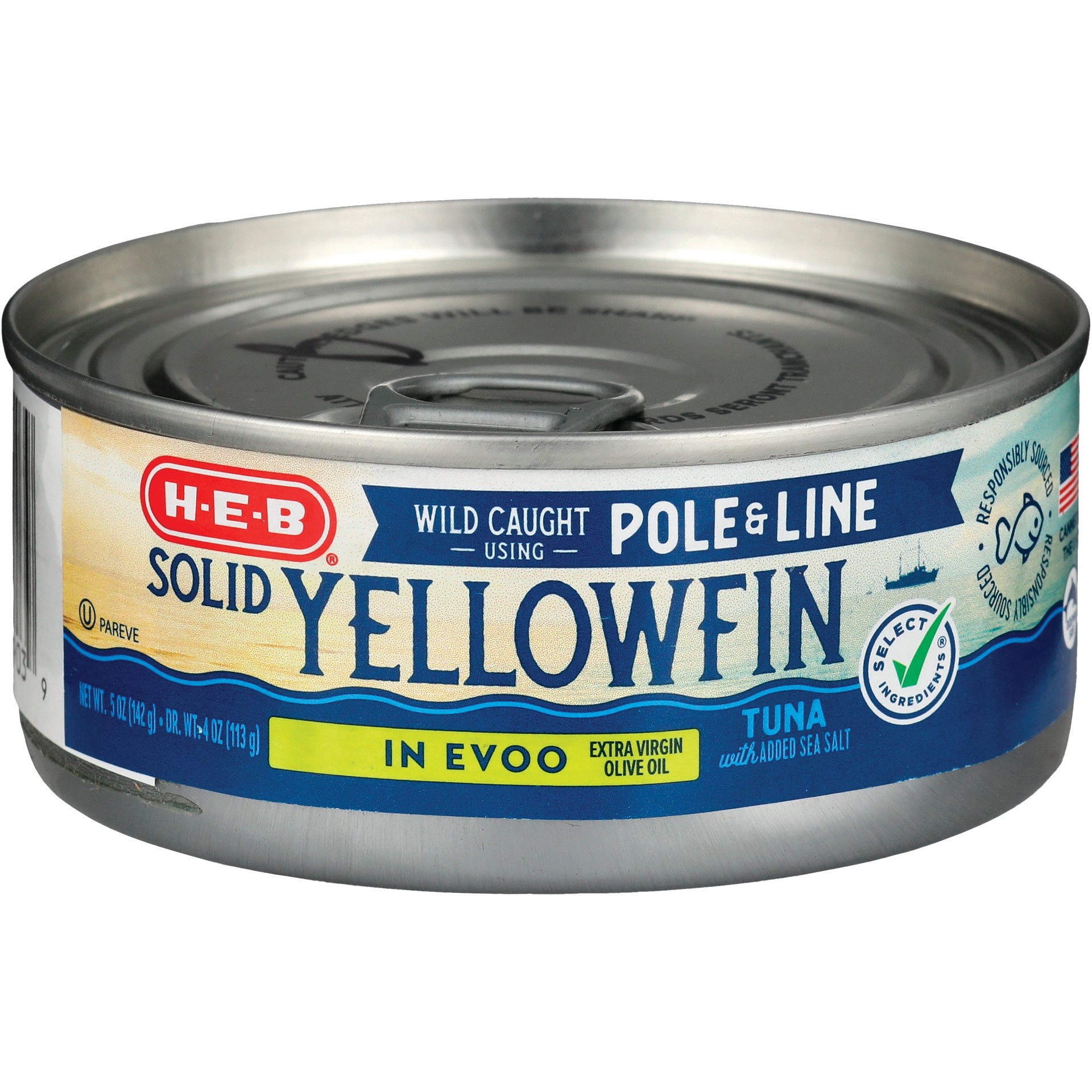Wild caught using a pole and line, this can of H-E-B solid yellowfin tuna is packed in extra virgin olive oil with added sea salt. Responsibly sourced and dolphin-safe, these flaky pieces have a soft …