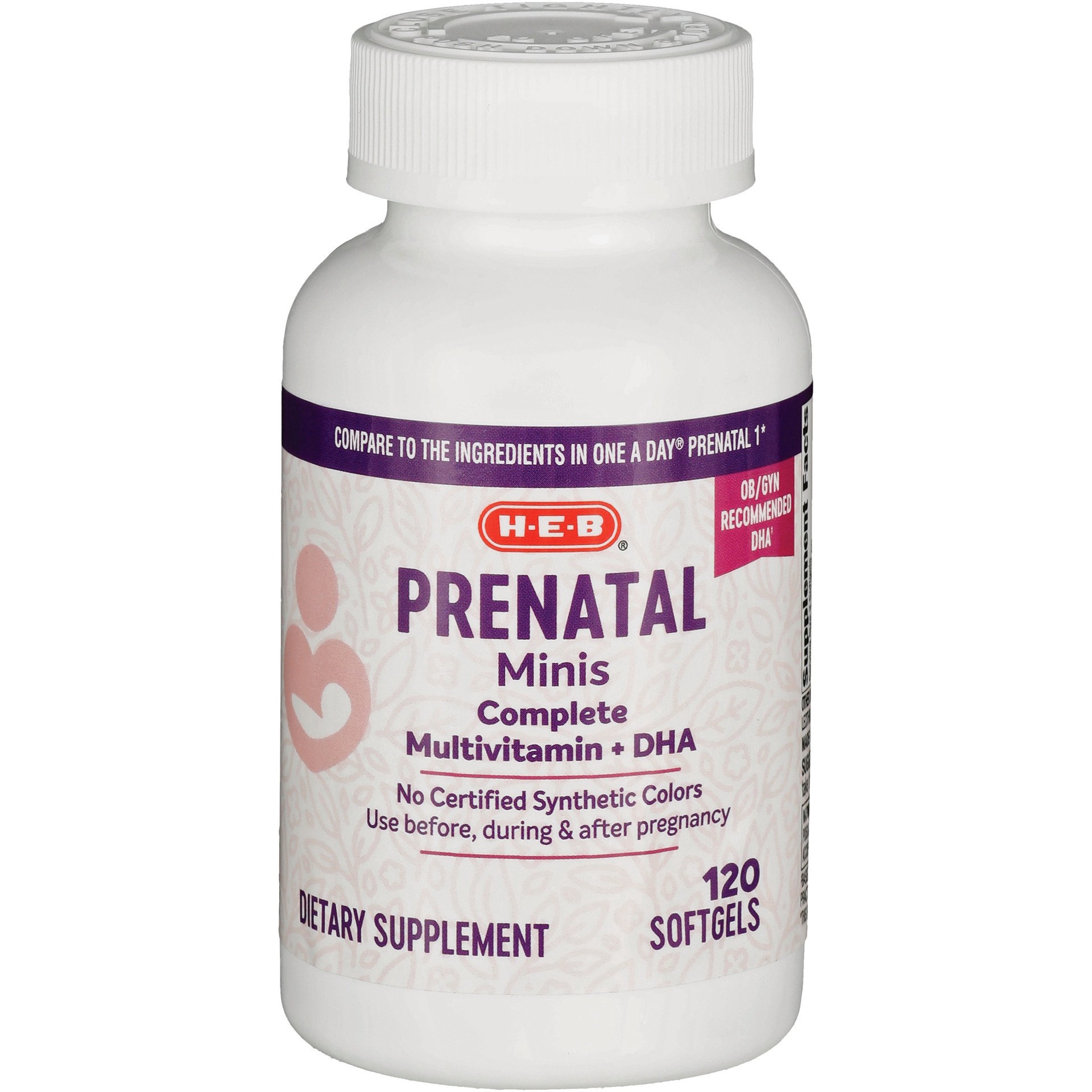 H-E-B Prenatal Minis is a complete multivitamin supplement with OB/GYN recommended DHA in easy-to-swallow mini softgels. Take this supplement daily before, during and after pregnancy to support mom an…