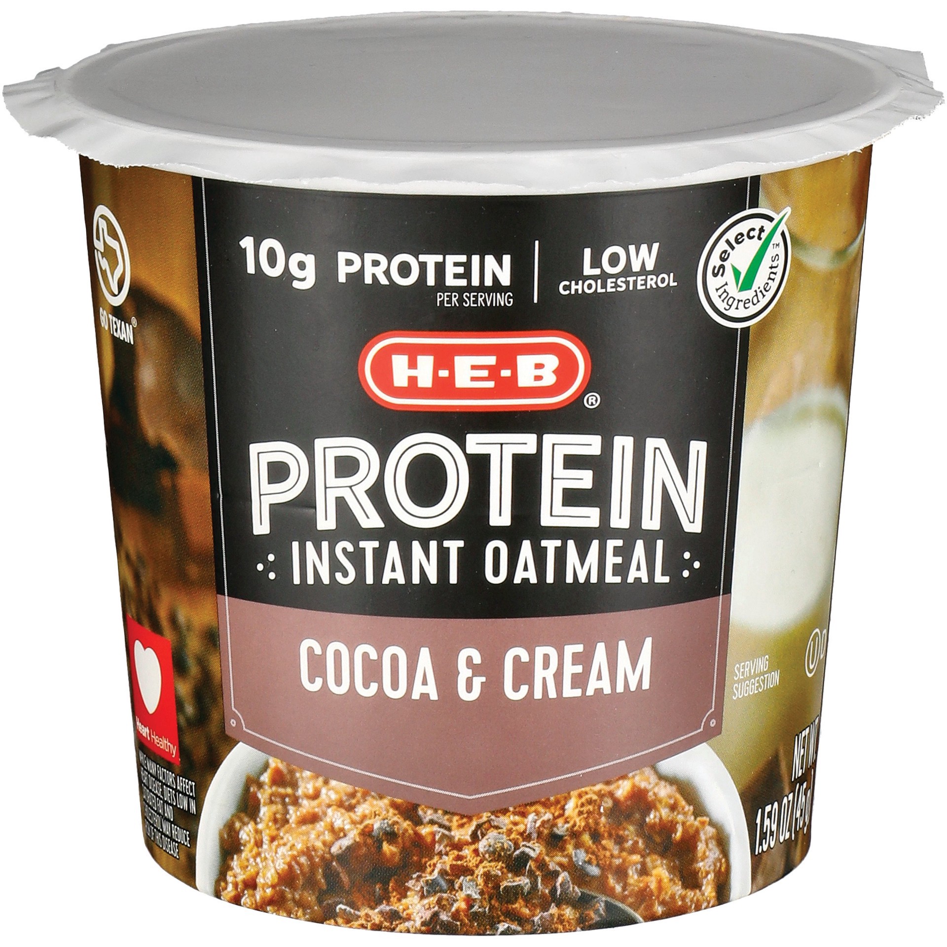 H-E-B Select Ingredients Protein Cocoa & Cream Instant Oatmeal is a delicious way to start your morning with 10g of Protein per Serving! Take a bite into a warm and cozy bowl of oats that is creamy an…