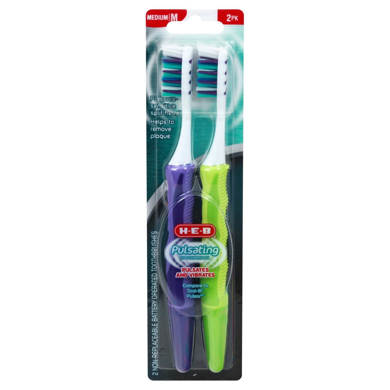 Medium Pulsating Toothbrush. Pulsates and Vibrates. Pressure sensitive split head! Helps to remove plaque. 1 Non-Replaceable Battery Operated Toothbrush. Compare to Oral-B Pulsar.