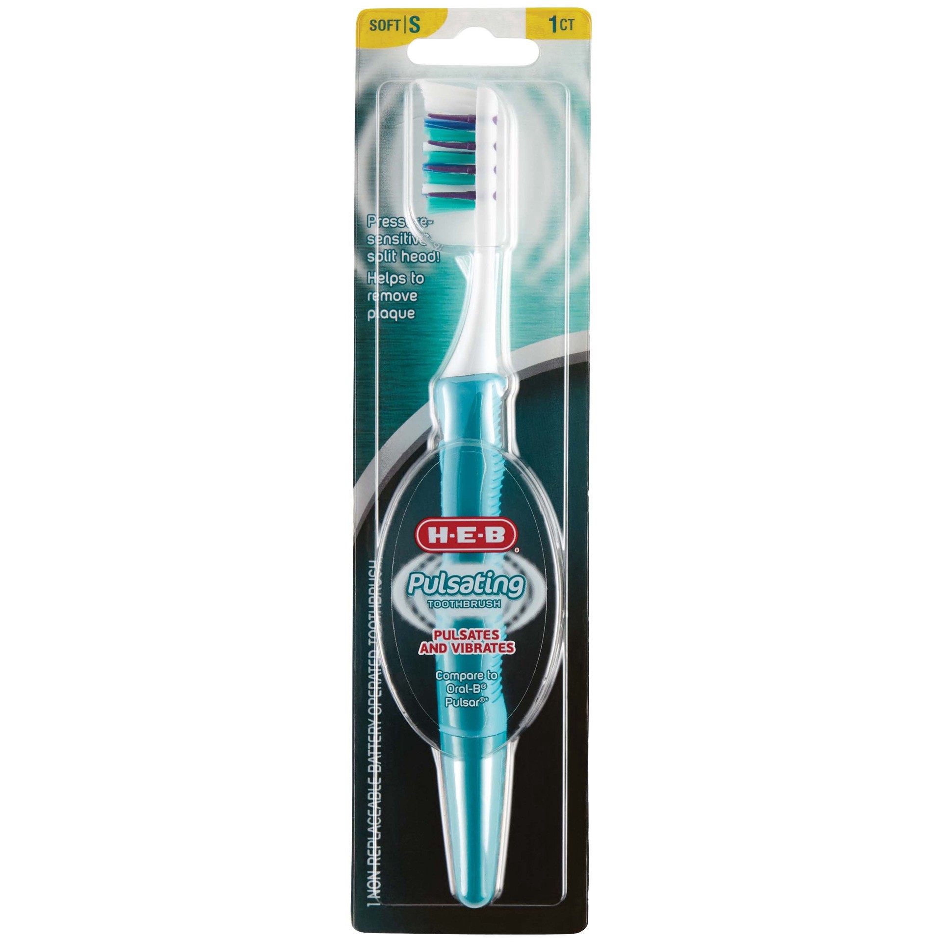 Brush your way to a cleaner smile with H-E-B Pulsating Soft Toothbrush! Pulsating bristles provide deep cleaning power while the vibrating flex head helps break up plaque.- 1 AAA battery included- Fleā¦